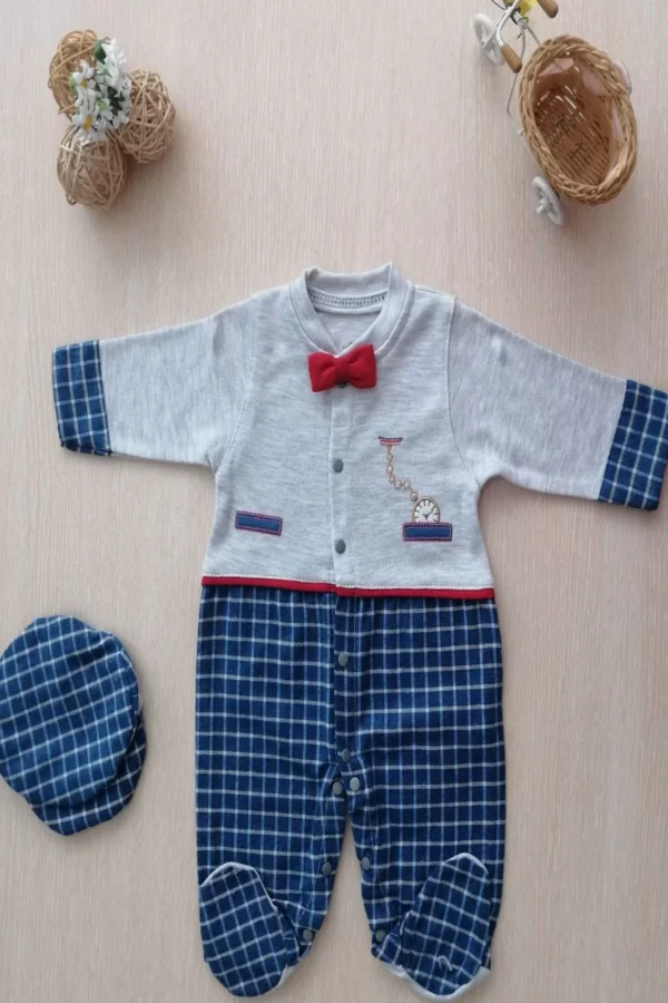 0-3 3-6 Ay Cep Saatli Kasketli Papyonlu Erkek Bebek Tulum Lacivert