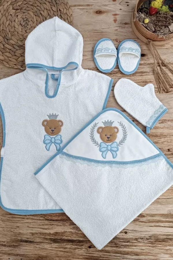 0-1 Yaş Bear Nakışlı Pareolu 4lü Erkek Bebek Havlu Silgi Takımı Mavi