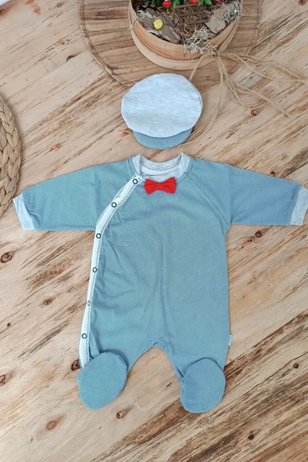0-3 3-6 Ay Papyonlu Çizgi Desen Çıtçıt Kapama Kasketli Erkek Bebek Tulumu