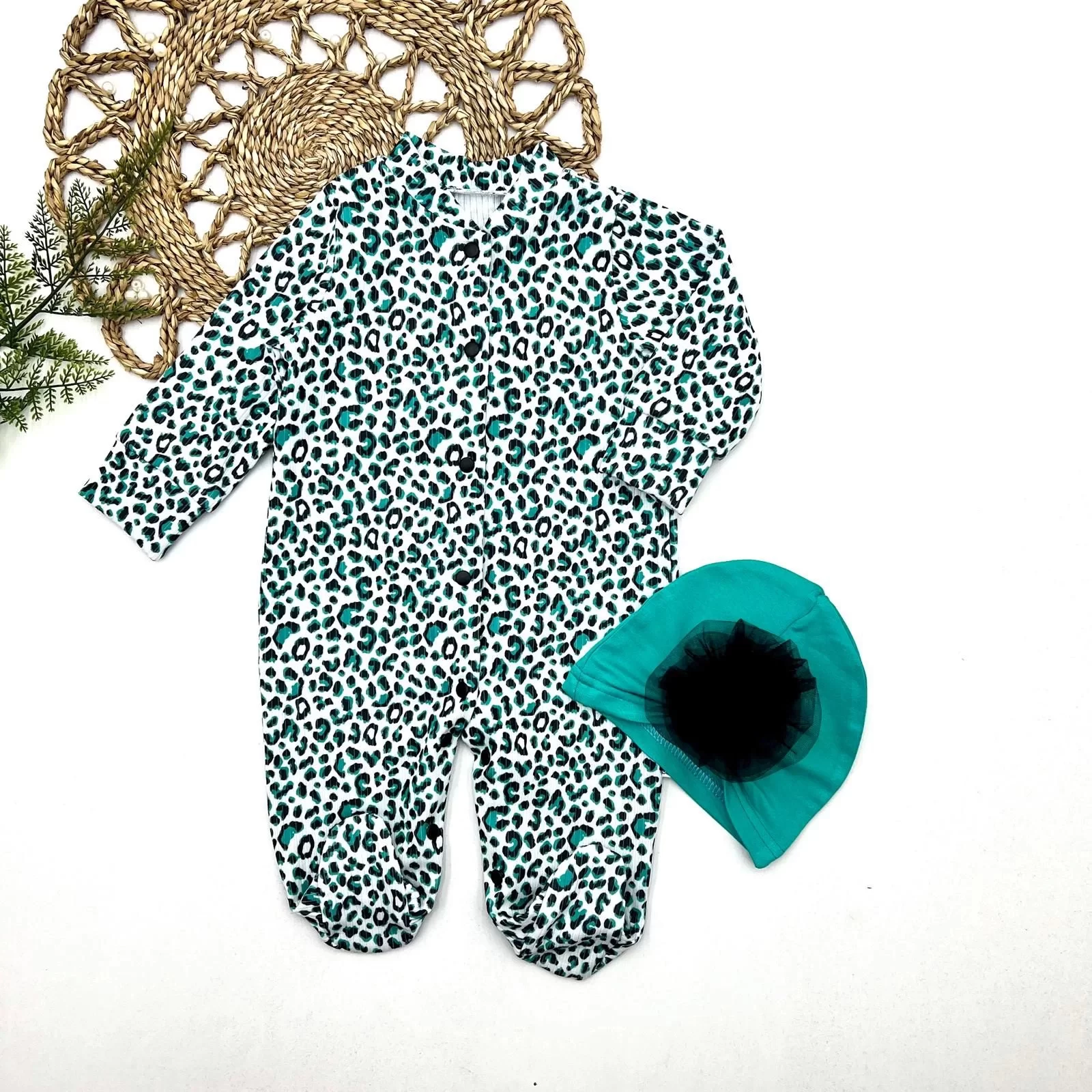0-3-6-9 Ay Leopar Baskılı Tam Boy Çıtçıtlı Patikli Güllü Boneli Kız Bebek Tulumu
