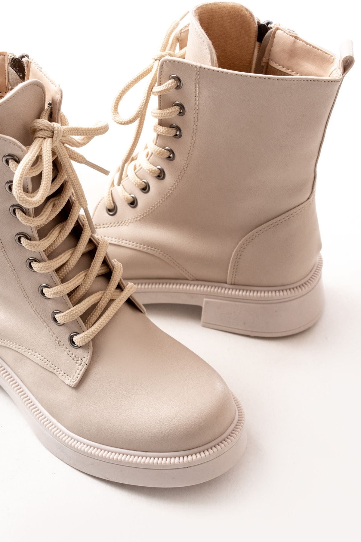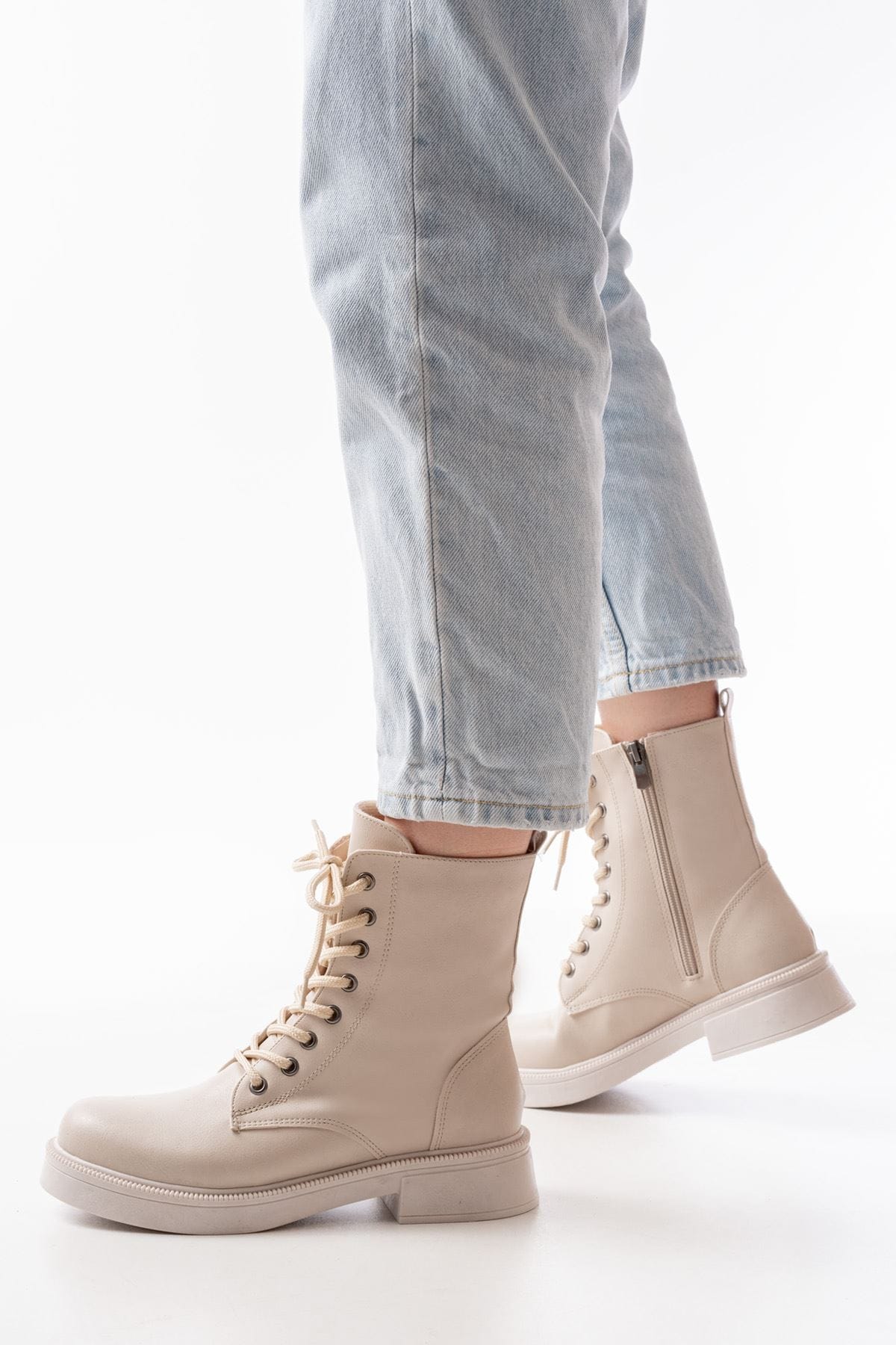 02-356 Bej Düz Topuklu Bağcıklı Fermuarlı Günlük Kadın Bot