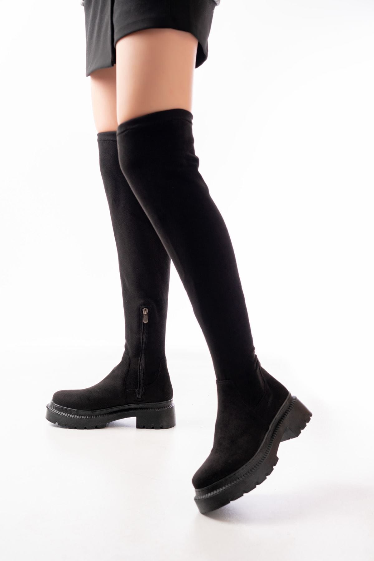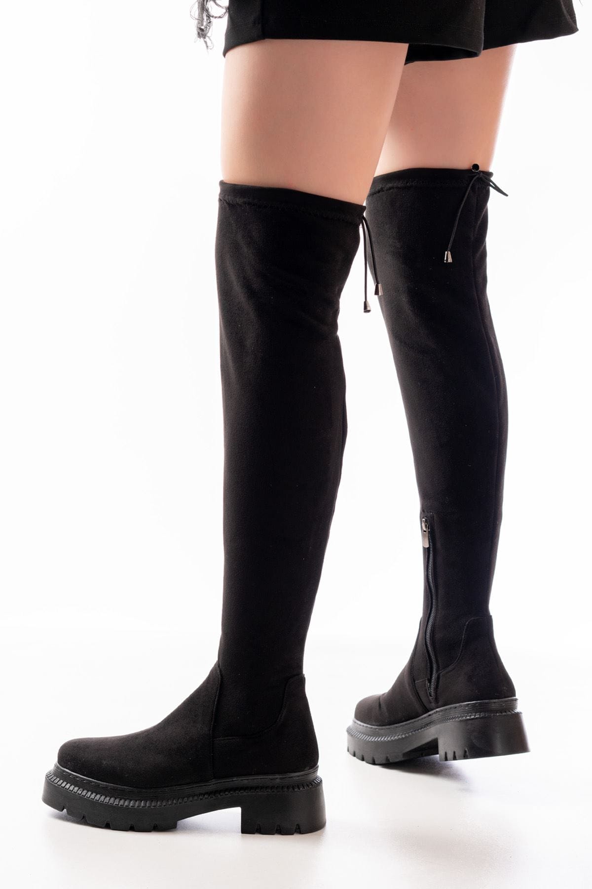 236-2194 Siyah Süet Streç Diz Üstü Fermuarlı Günlük Kadın Çizme