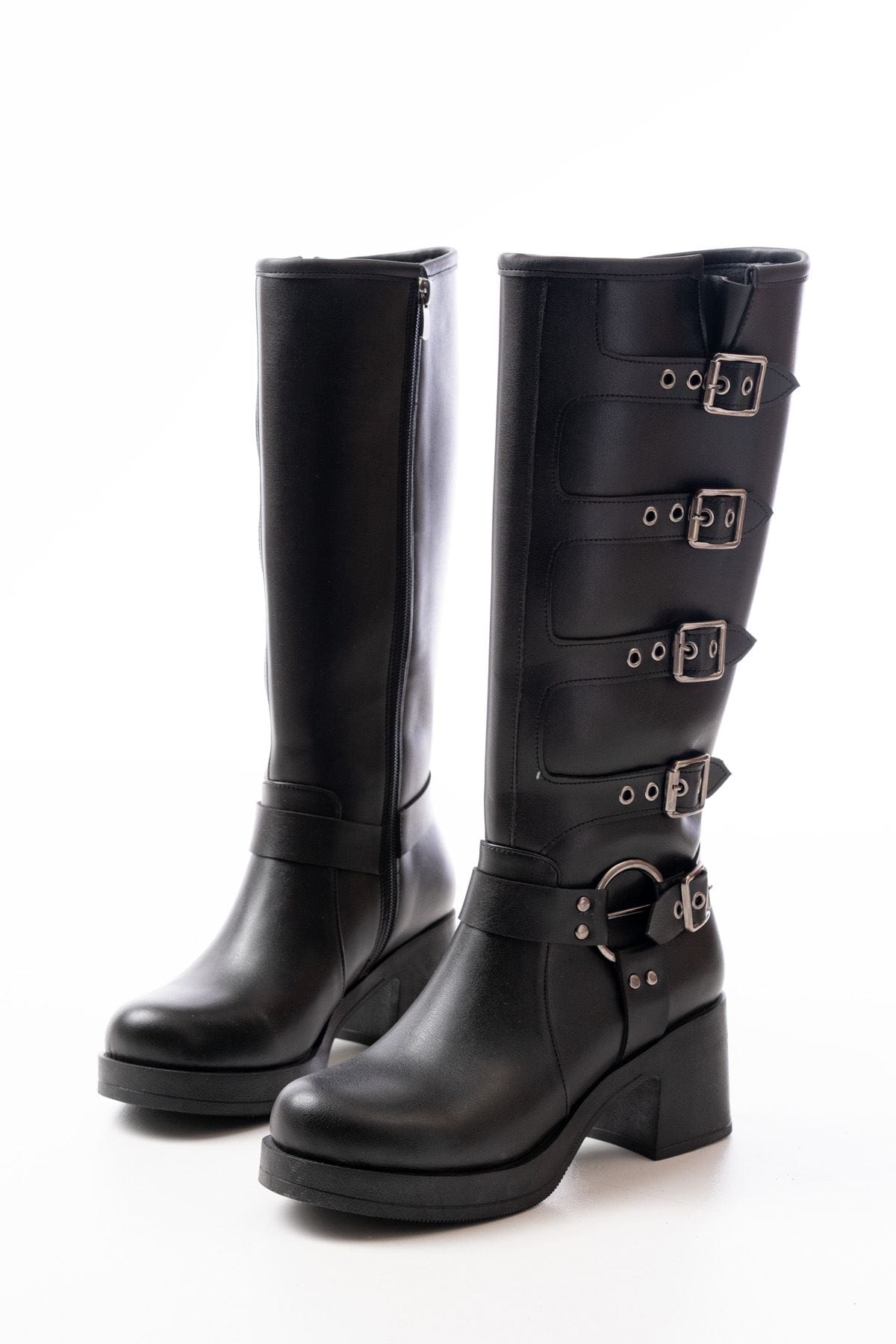5109-3015 Siyah Topuklu Fermuarlı Toka Aksesuarlı Günlük Kadın Çizme