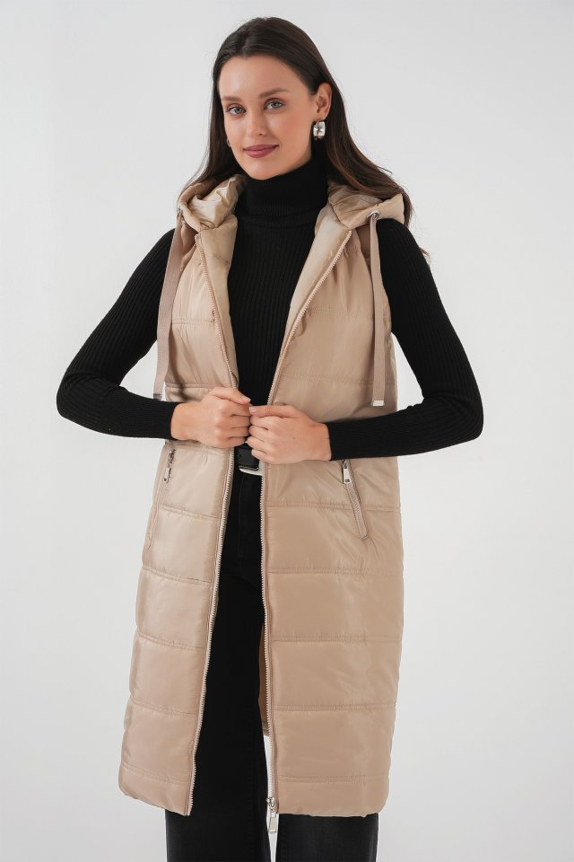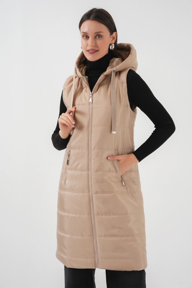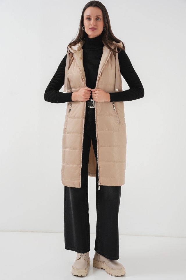 5140 Kapşonlu Uzun Şişme Yelek – Bisküvi