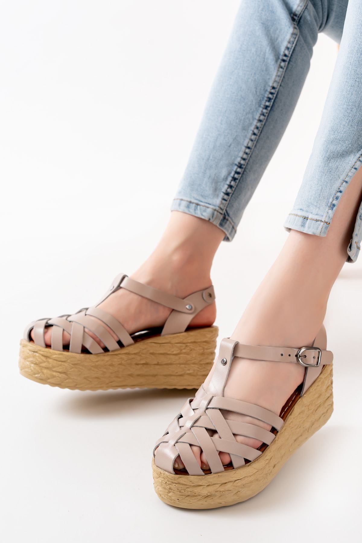684-02 Bej Ortopedik Hakiki Deri Dolgu Kadın Sandalet