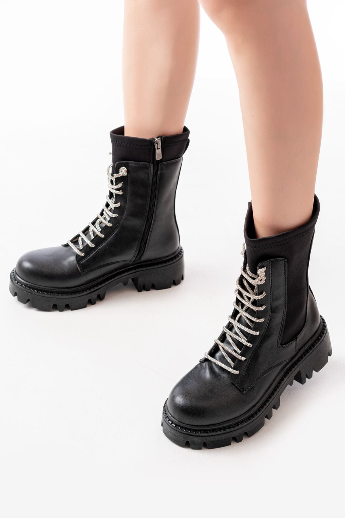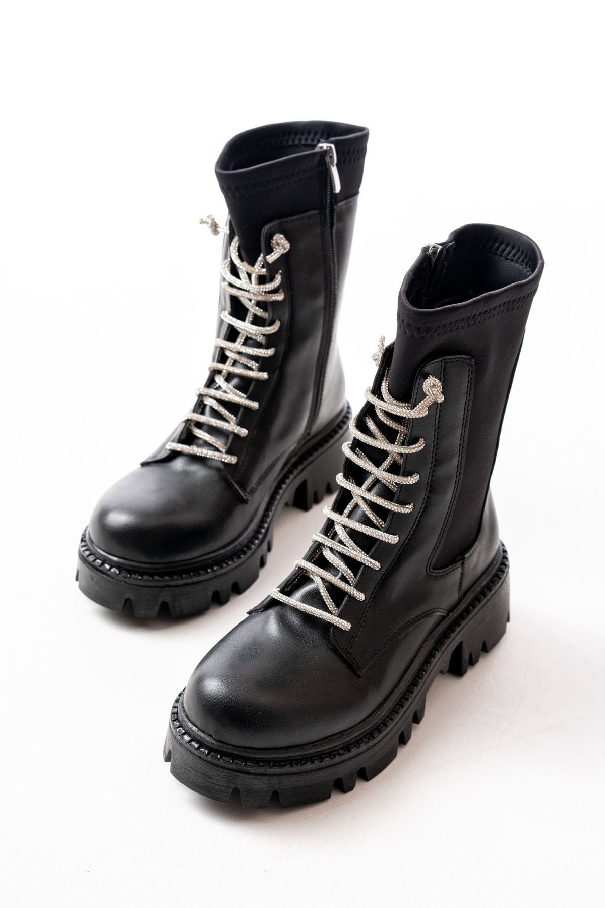 868-2006 Siyah Düz Topuklu Bağcıklı Fermuarlı Günlük Kadın Bot