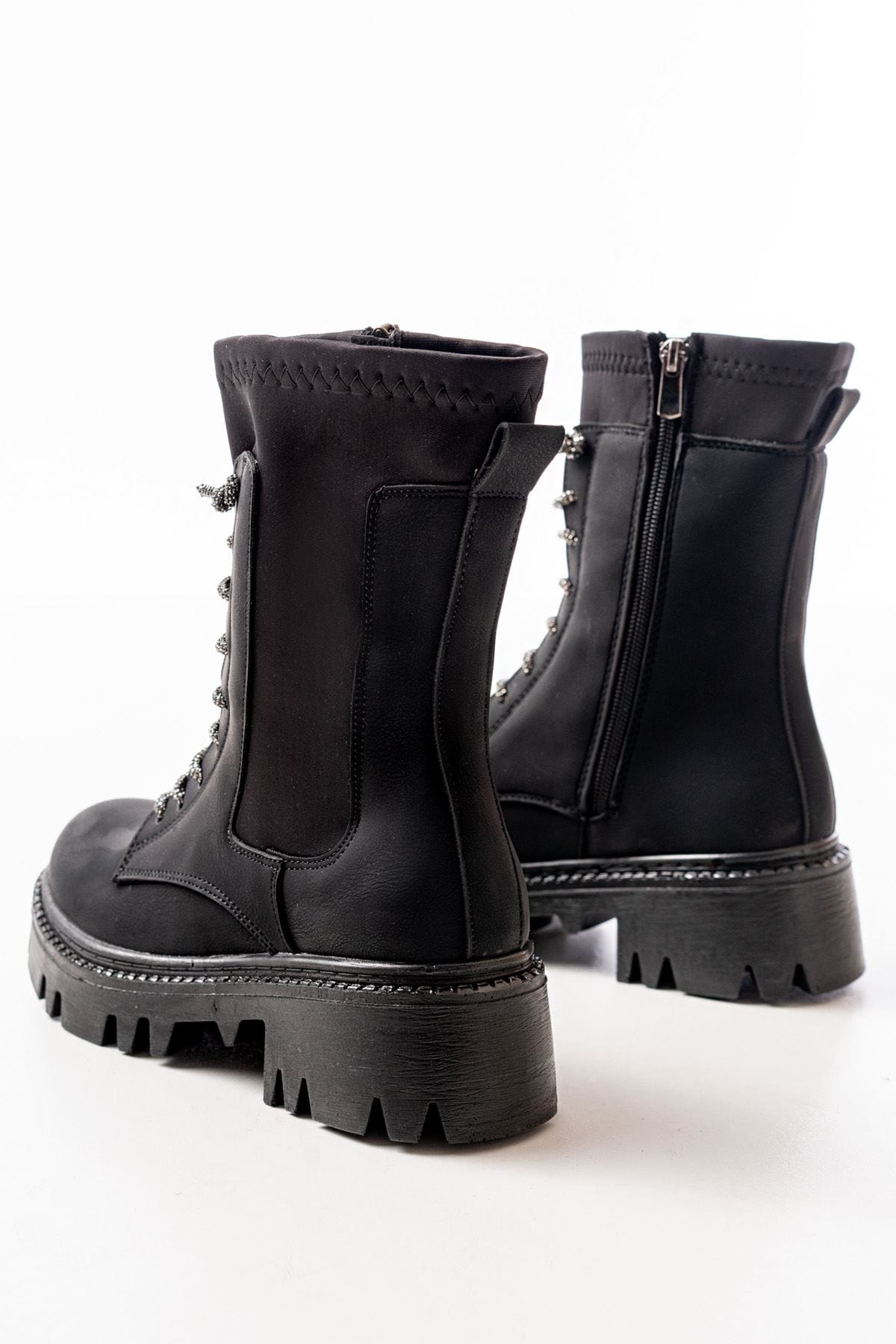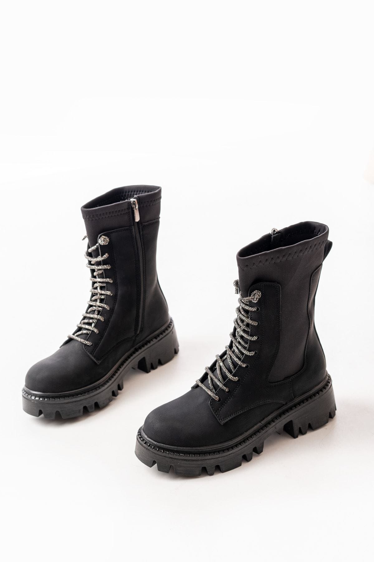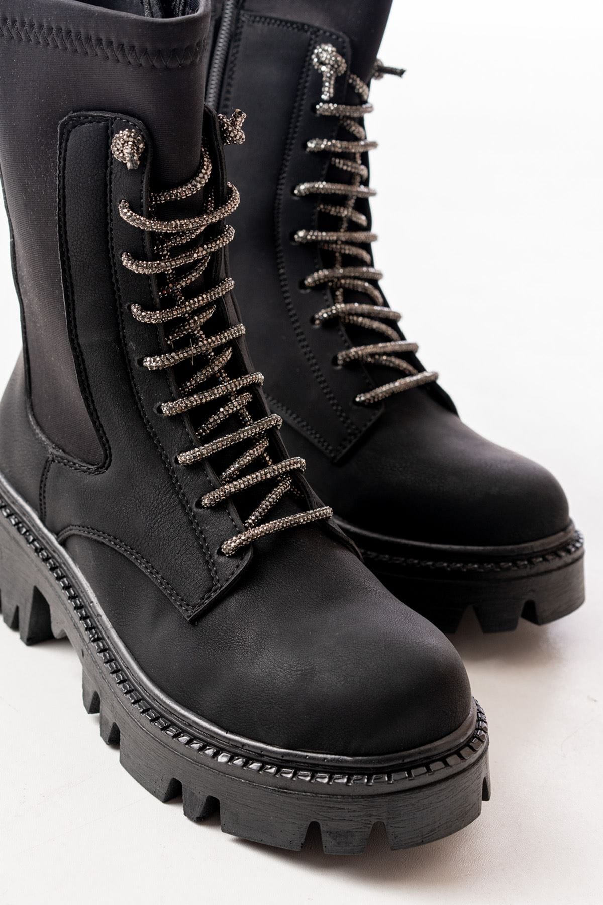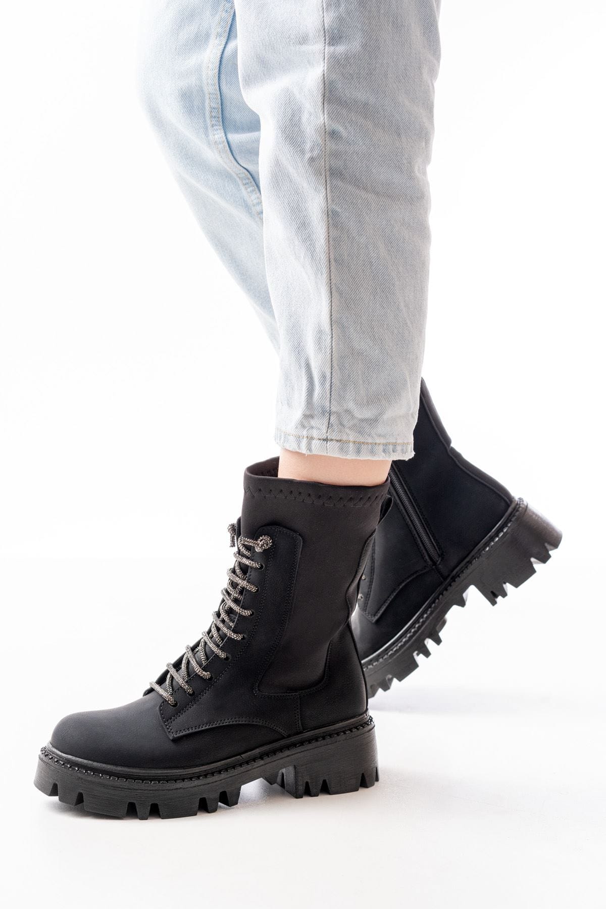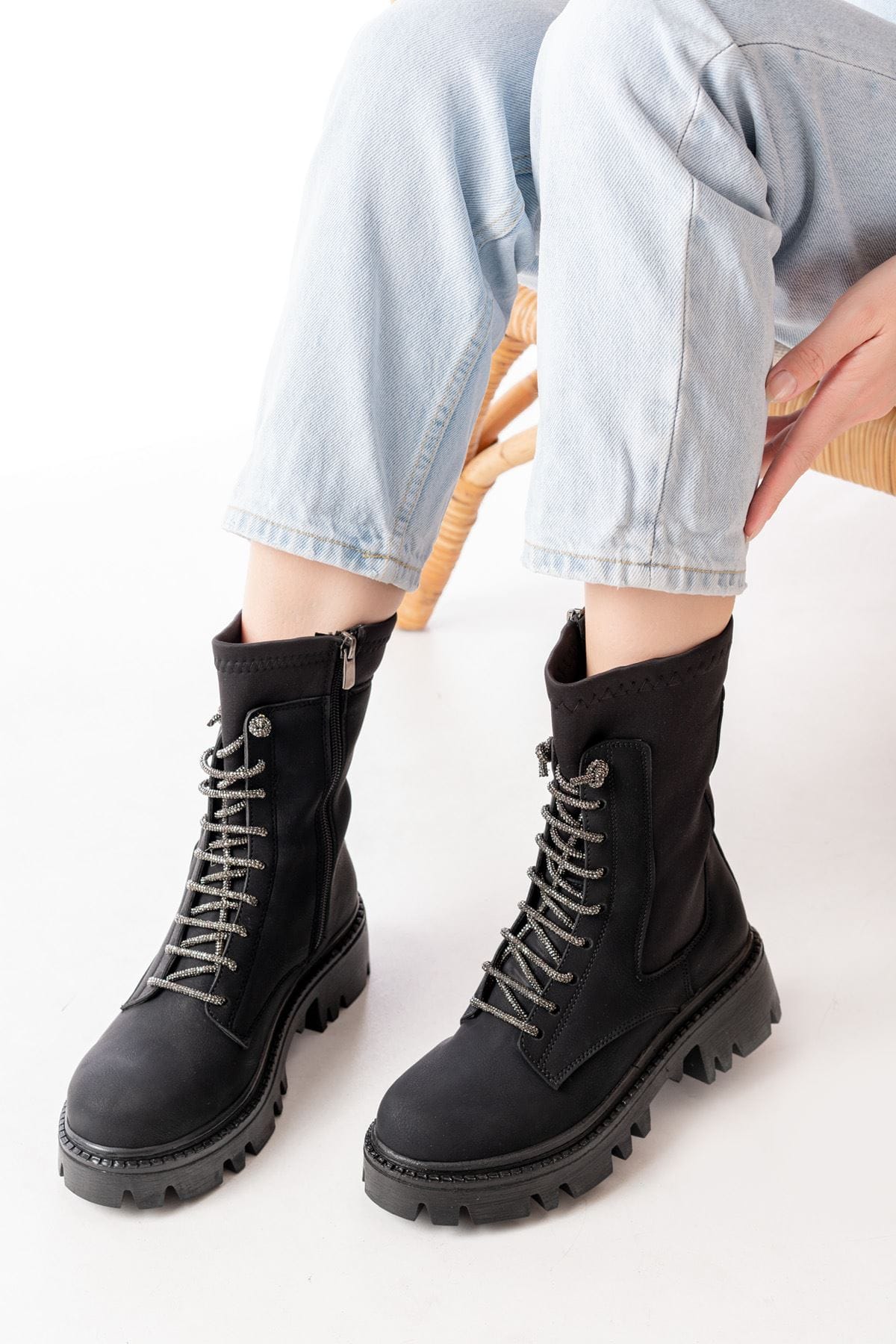 868-2006 Siyah Zümrüt Düz Topuklu Bağcıklı Fermuarlı Günlük Kadın Bot