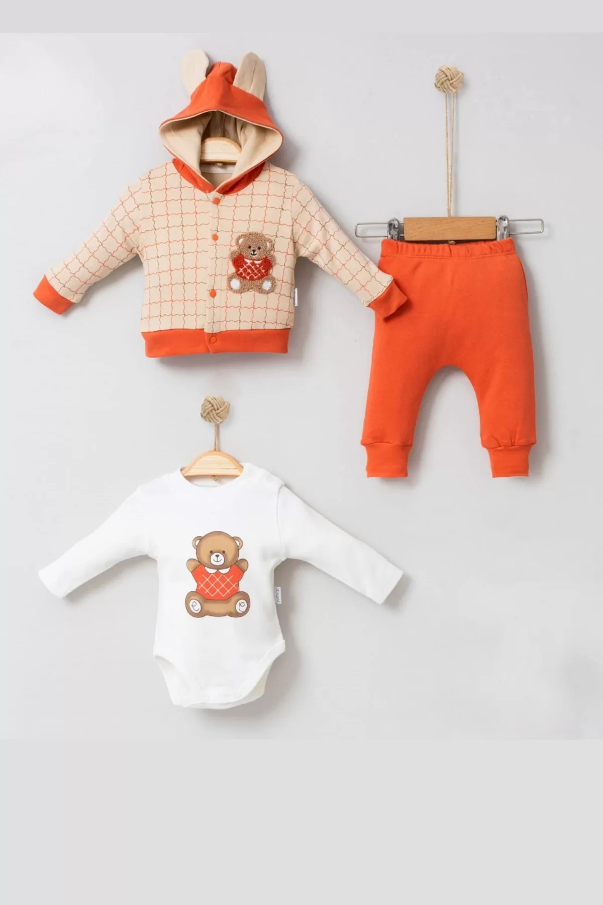 Bear Çizgili % 100 Pamuk Hırkalı 3’lü Bebek Takımı