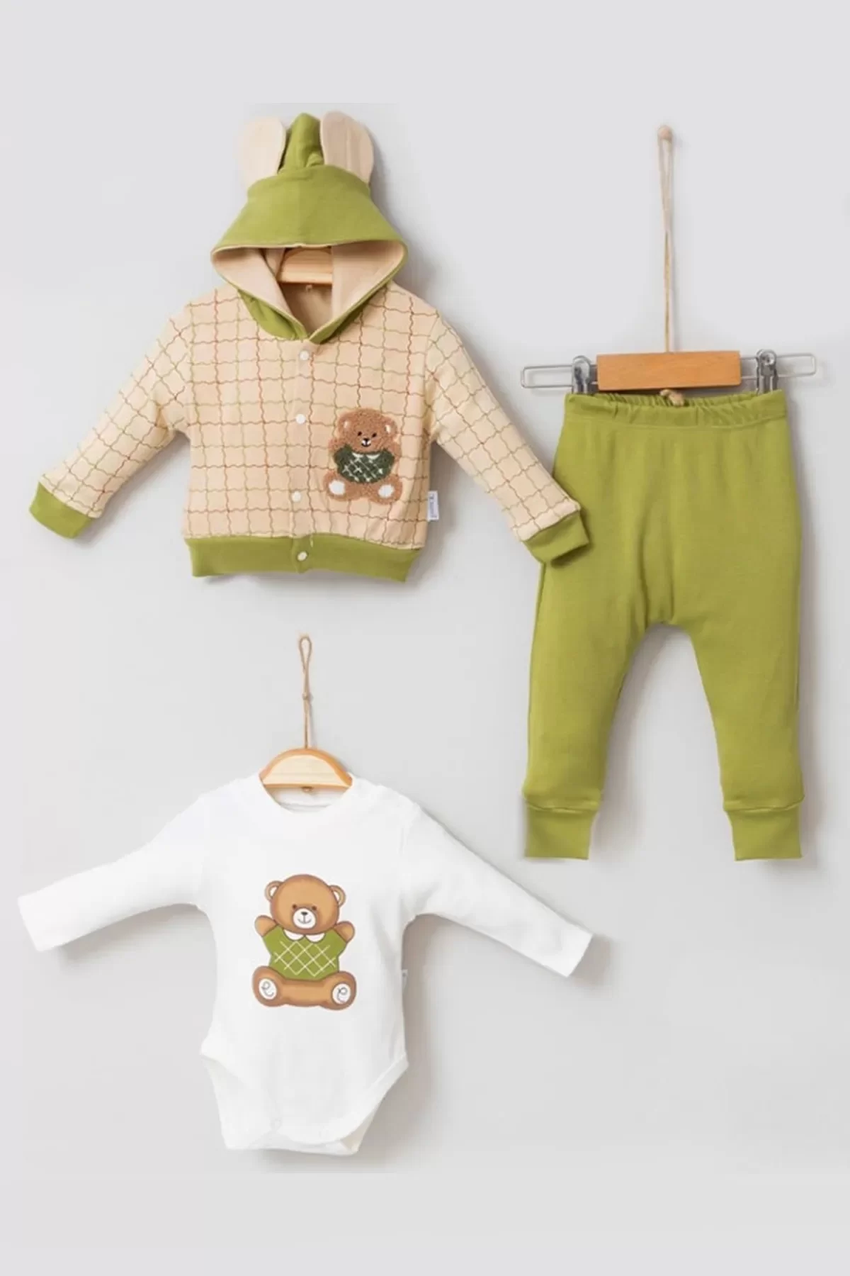 Bear Çizgili % 100 Pamuk Hırkalı 3’lü Bebek Takımı