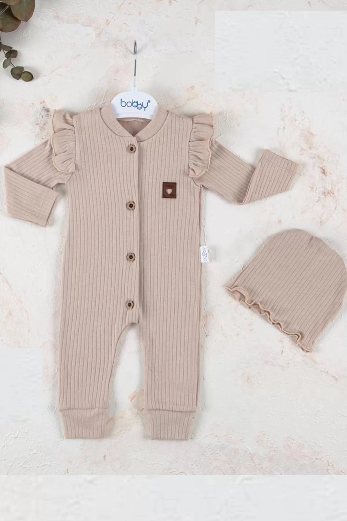 Boydan Düğmeli Şapkalı % 100 Pamuk Kız Bebek Tulumu.