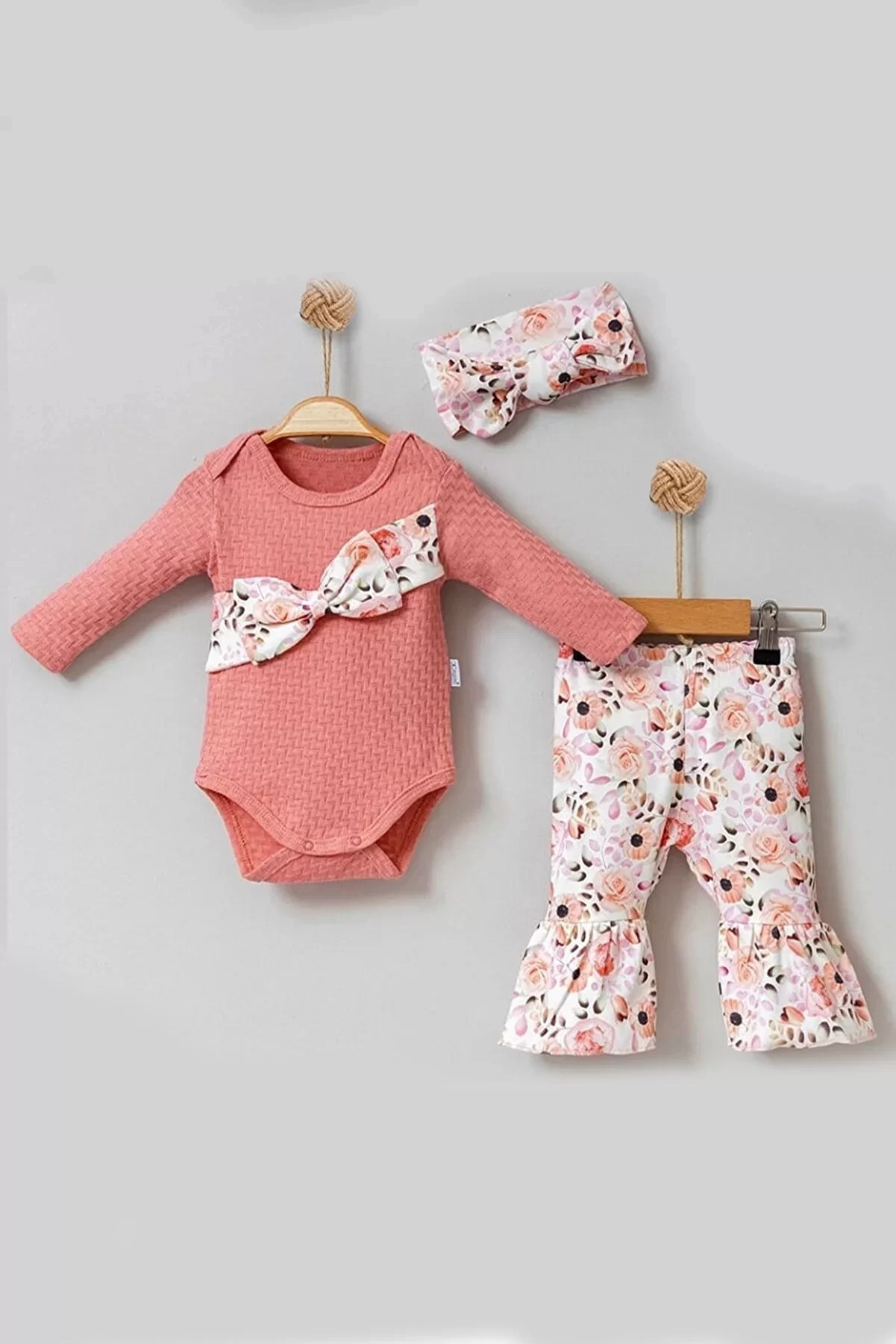 Çiçek Desenli Fiyonklu 3’lü Kız Bebek Takım