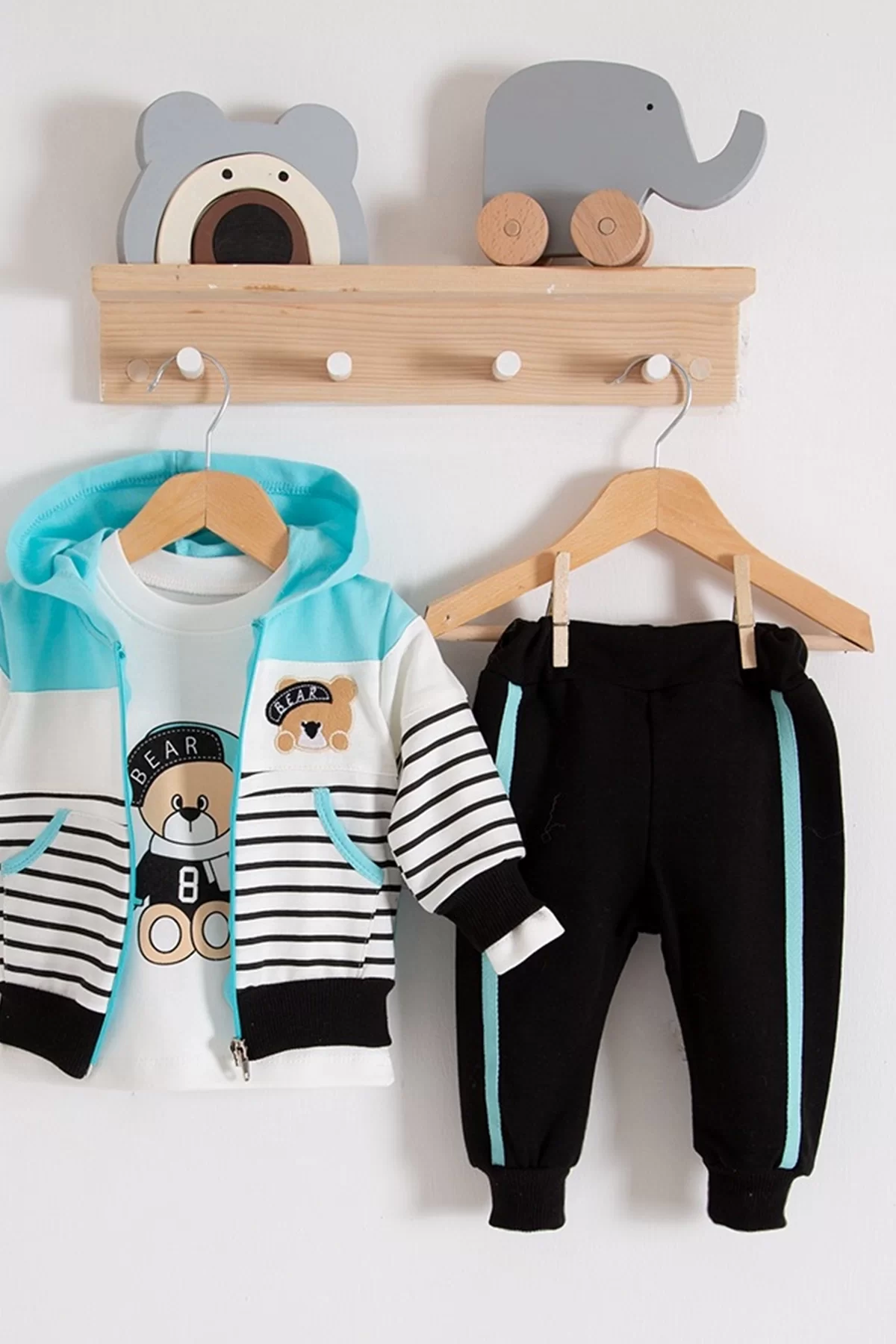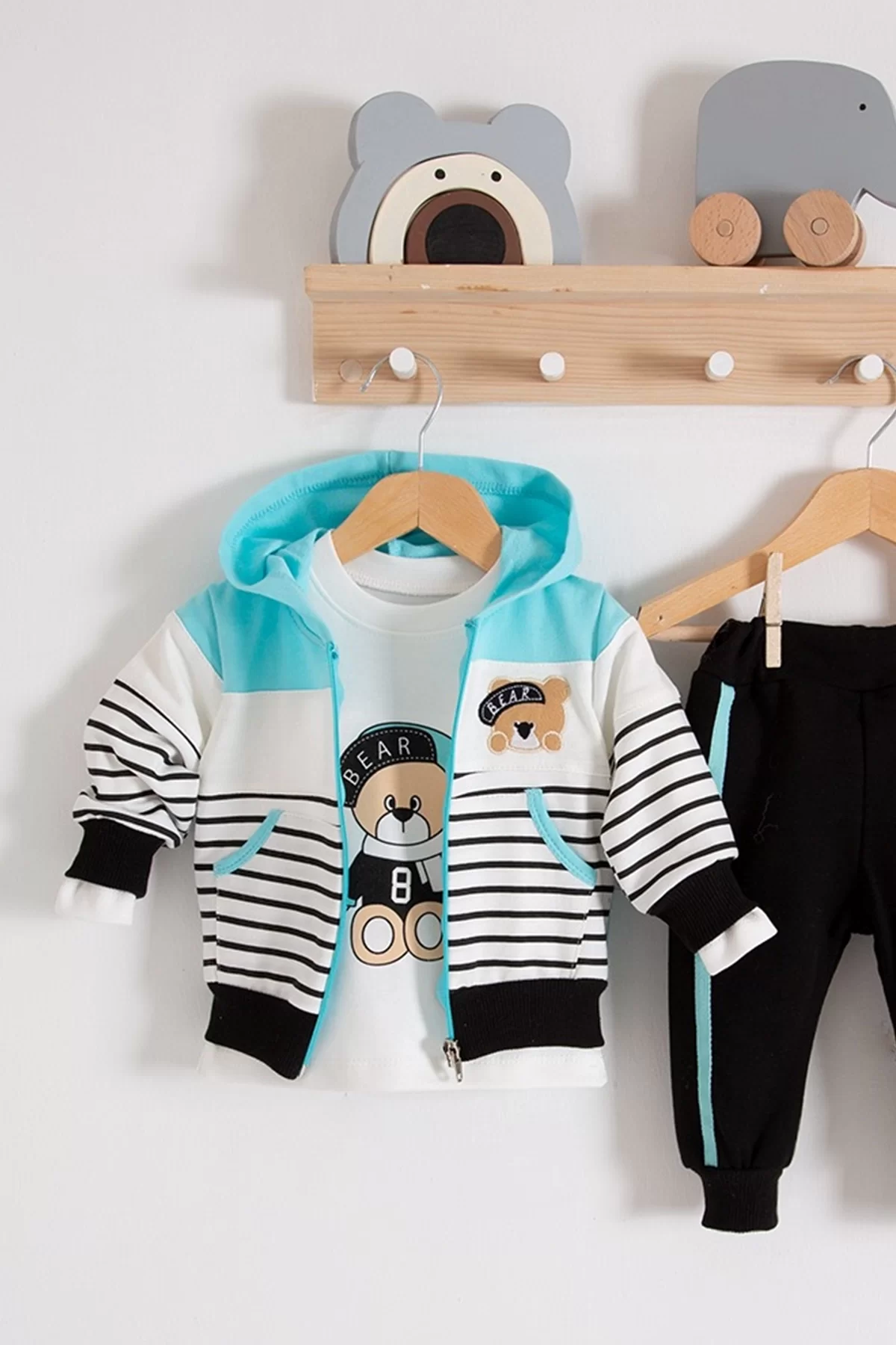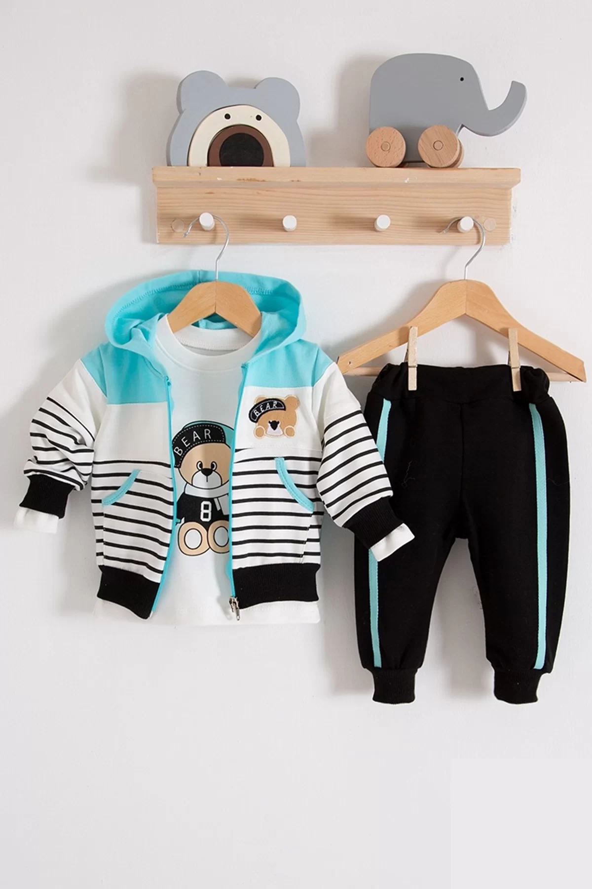 Çizgili Bear Desenli 3’lü Erkek Bebek Takımı