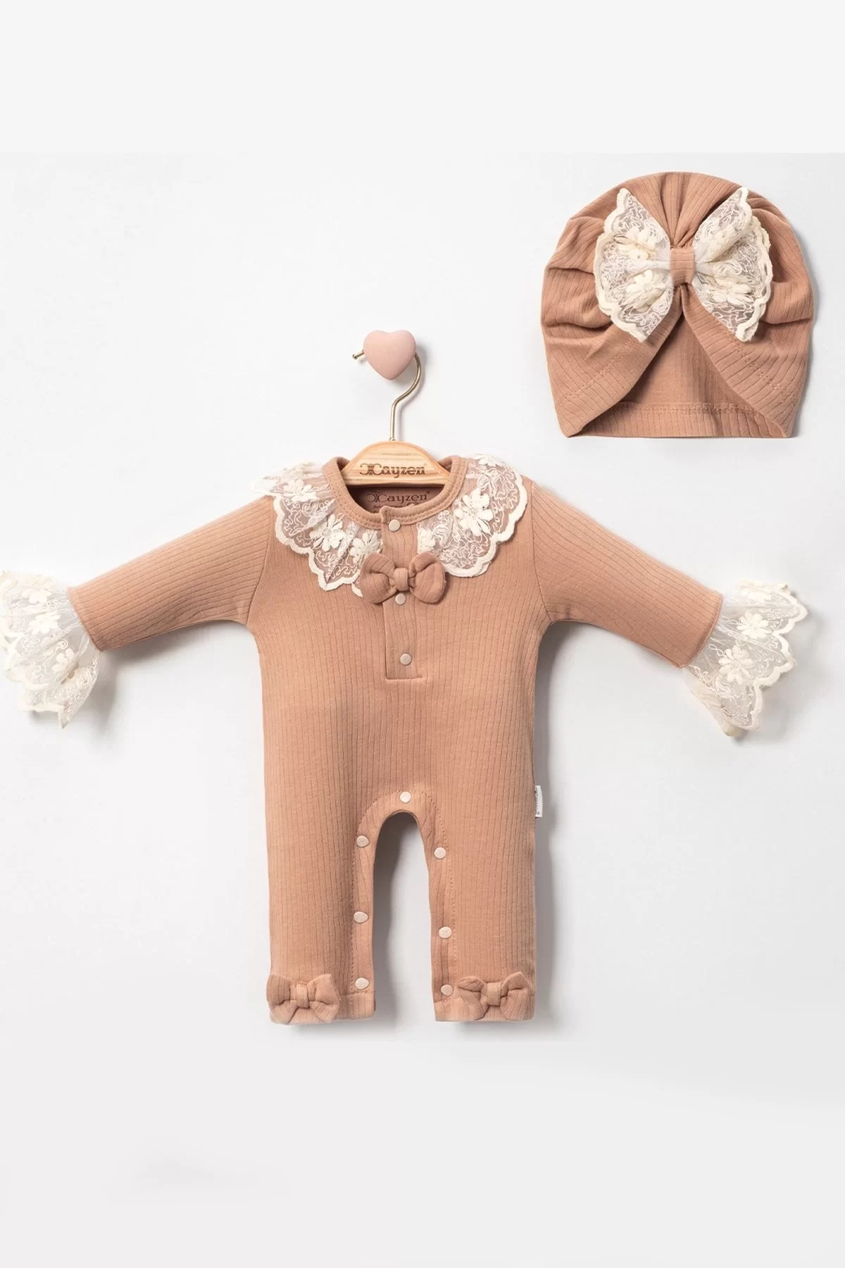 Dantel Yaka Detaylı Şapkalı 2’Li Kız Bebek Tulum