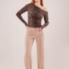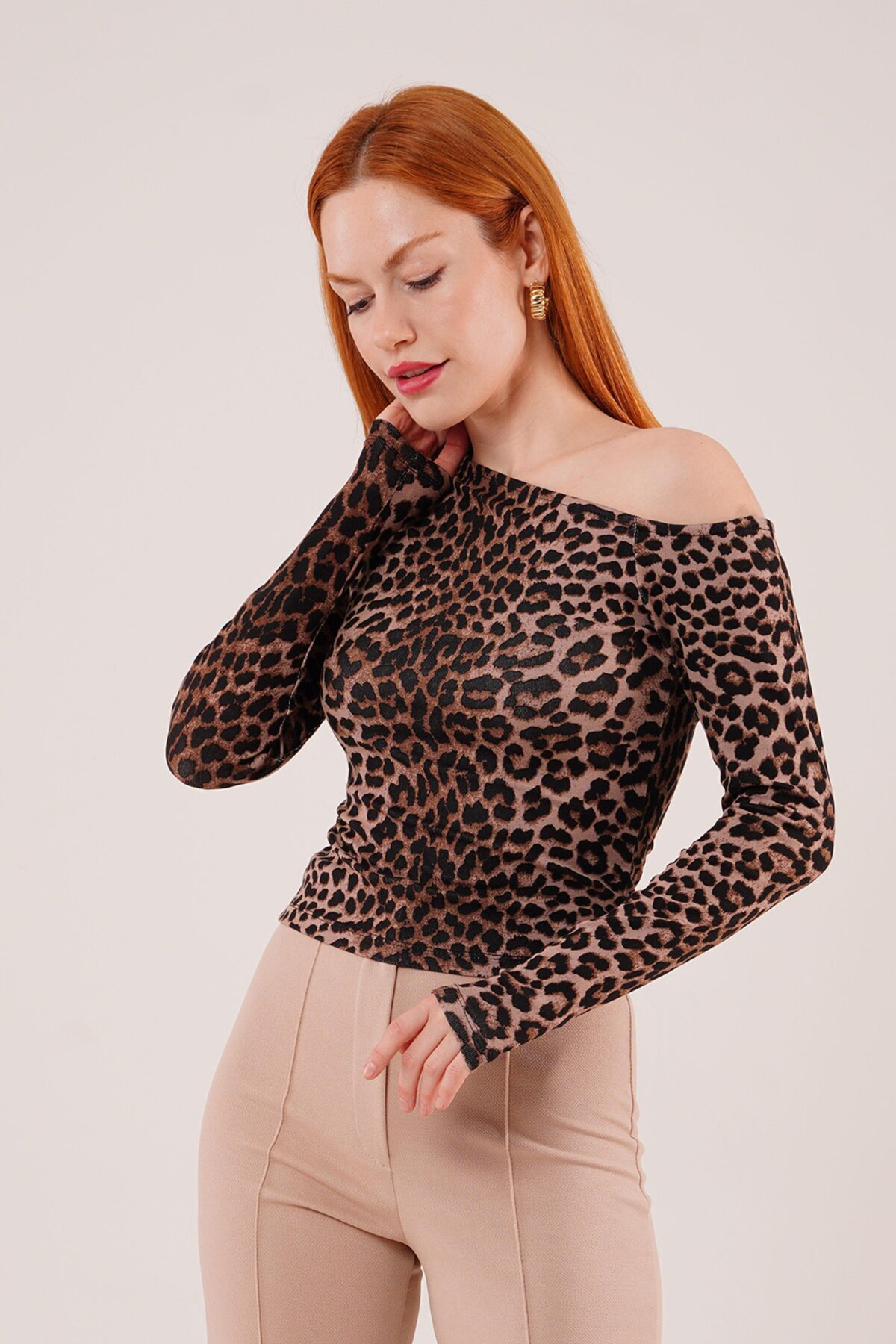Düşük Omuz Detaylı Leopar Desen Bluz