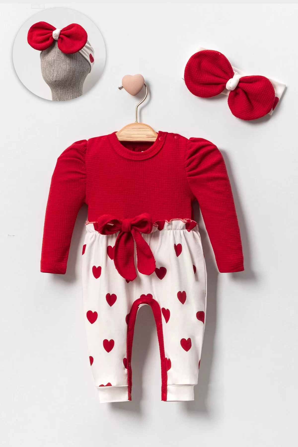 Kız Bebek Kalp Desenli Waffle Bandanalı 2’li Tulum