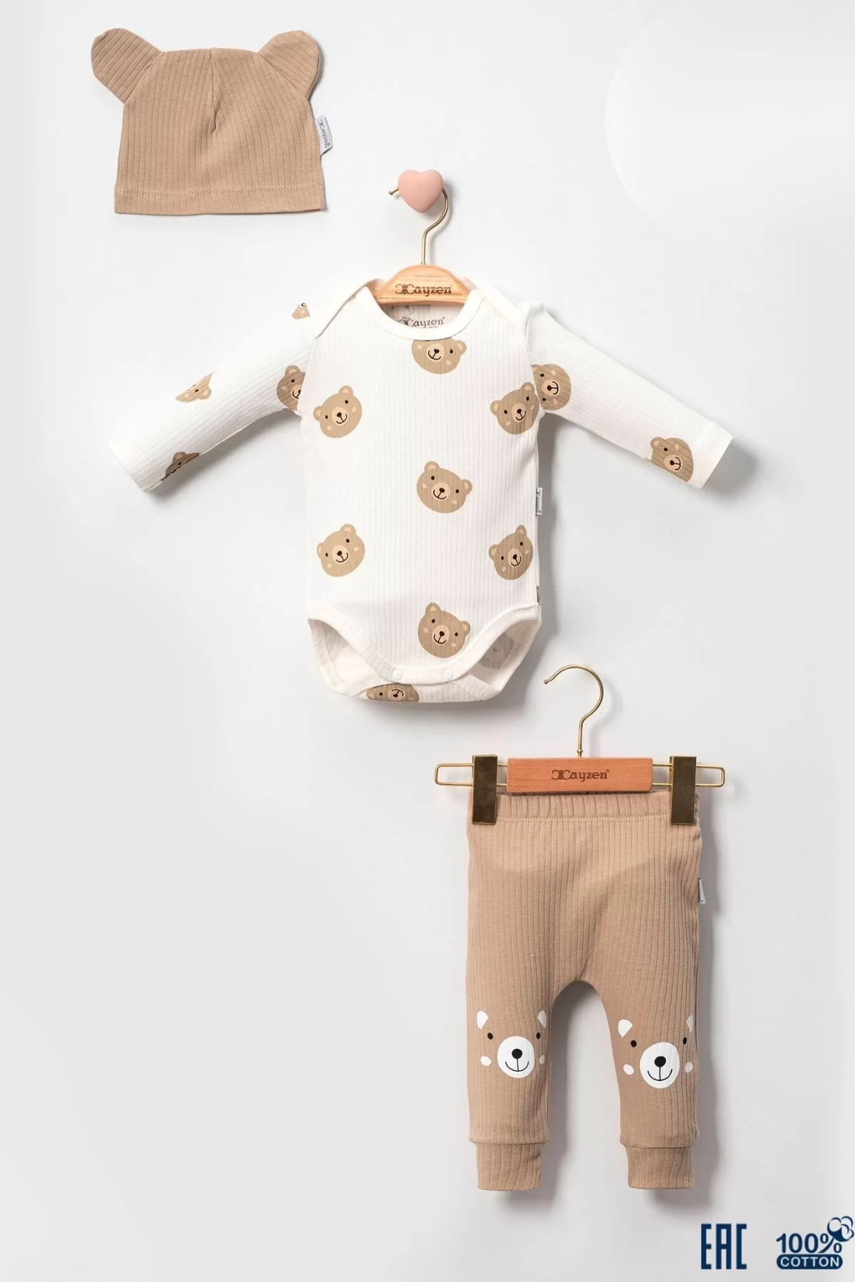Kulaklı Ayıcık % 100 Pamuk 3’lü Erkek Bebek Takım.