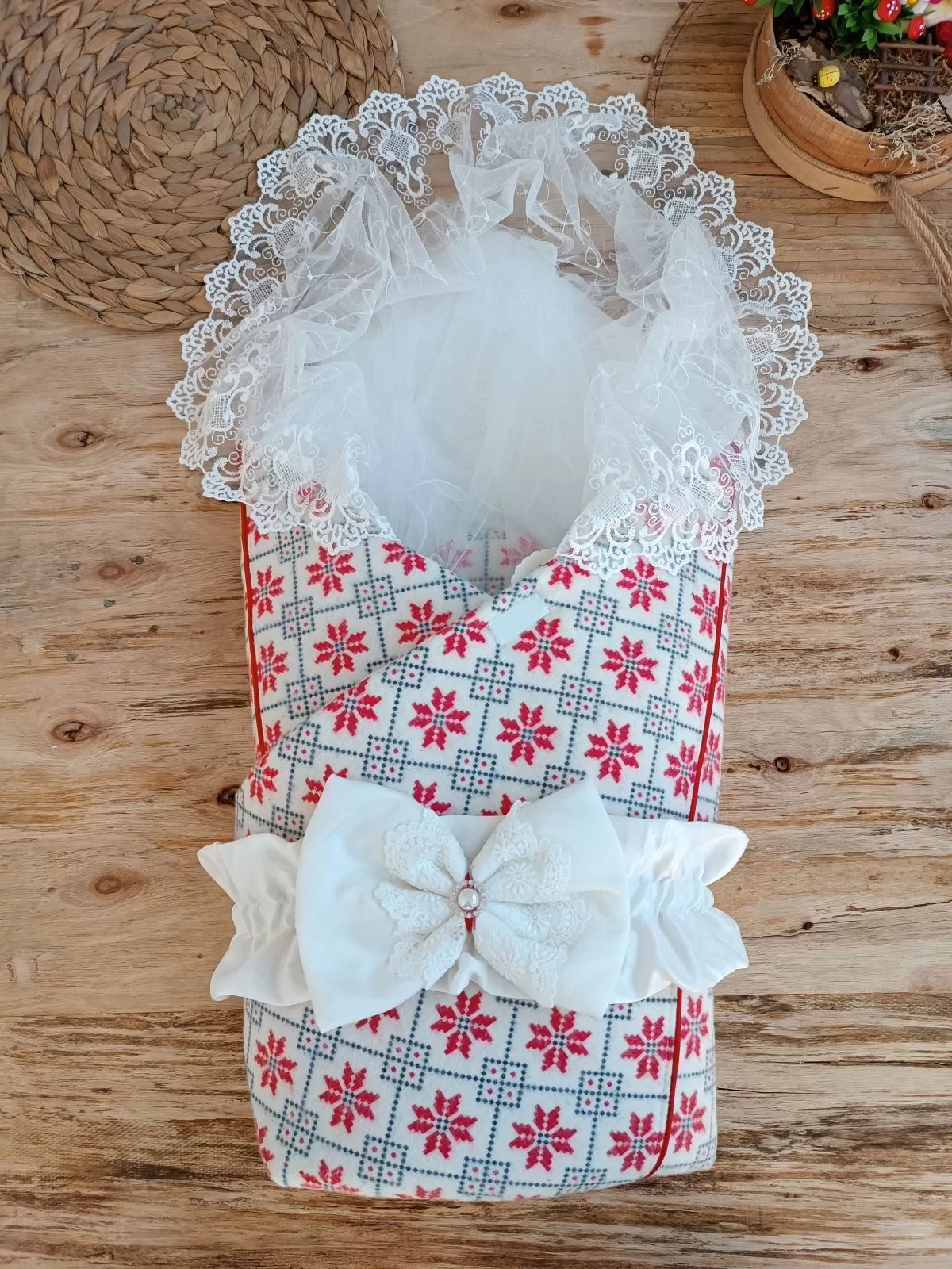 Yenidoğan Kar Tanesi Desenli Dantelli Duvaklı Bebek Battaniyesi Kundak