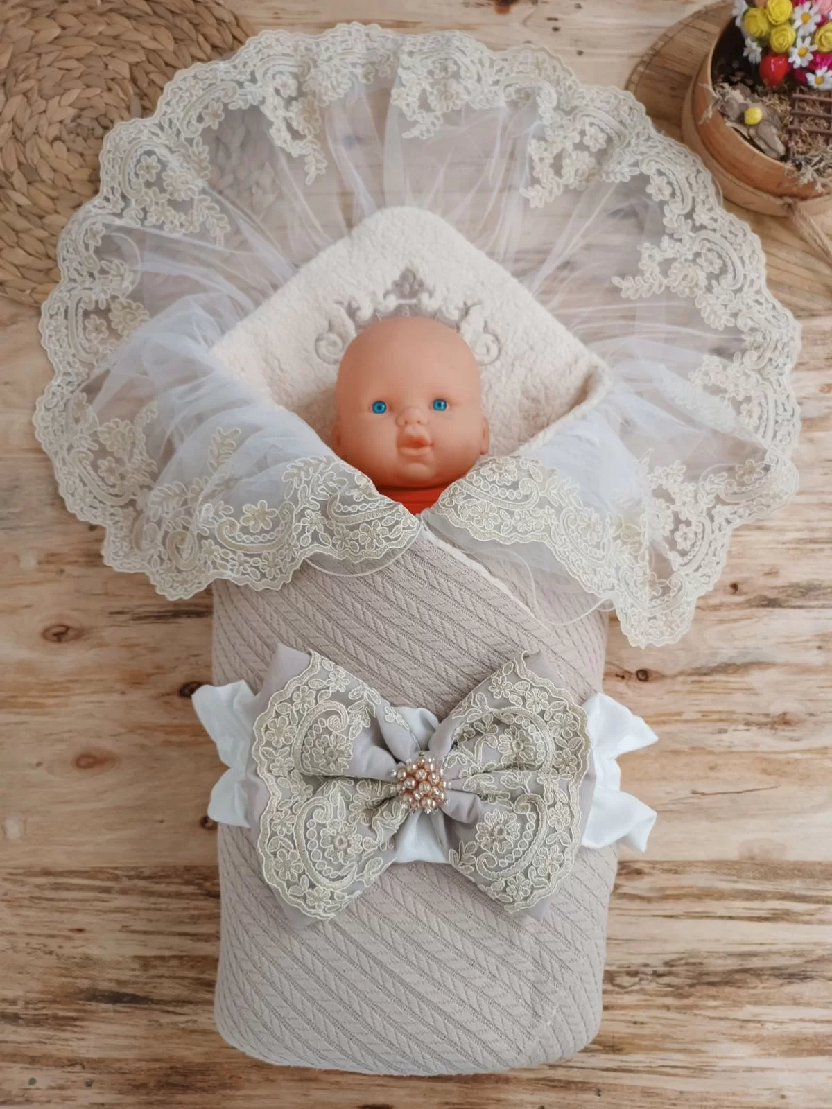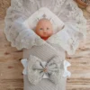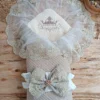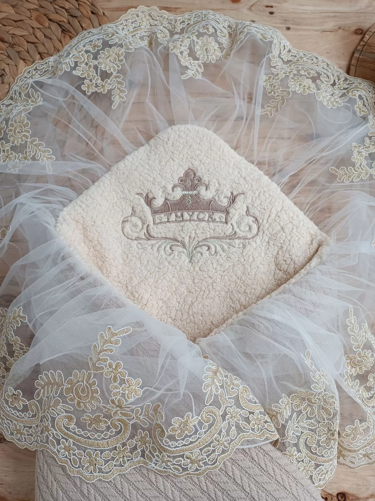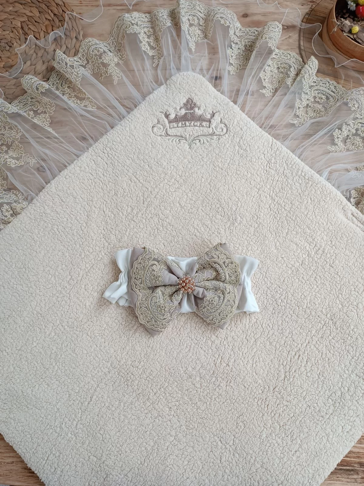 Yenidoğan Kuzulu Taç Nakış Güpürlü Fiyonklu Duvaklı Prizma Taş Unisex Kundak Bebek Battaniyesi