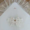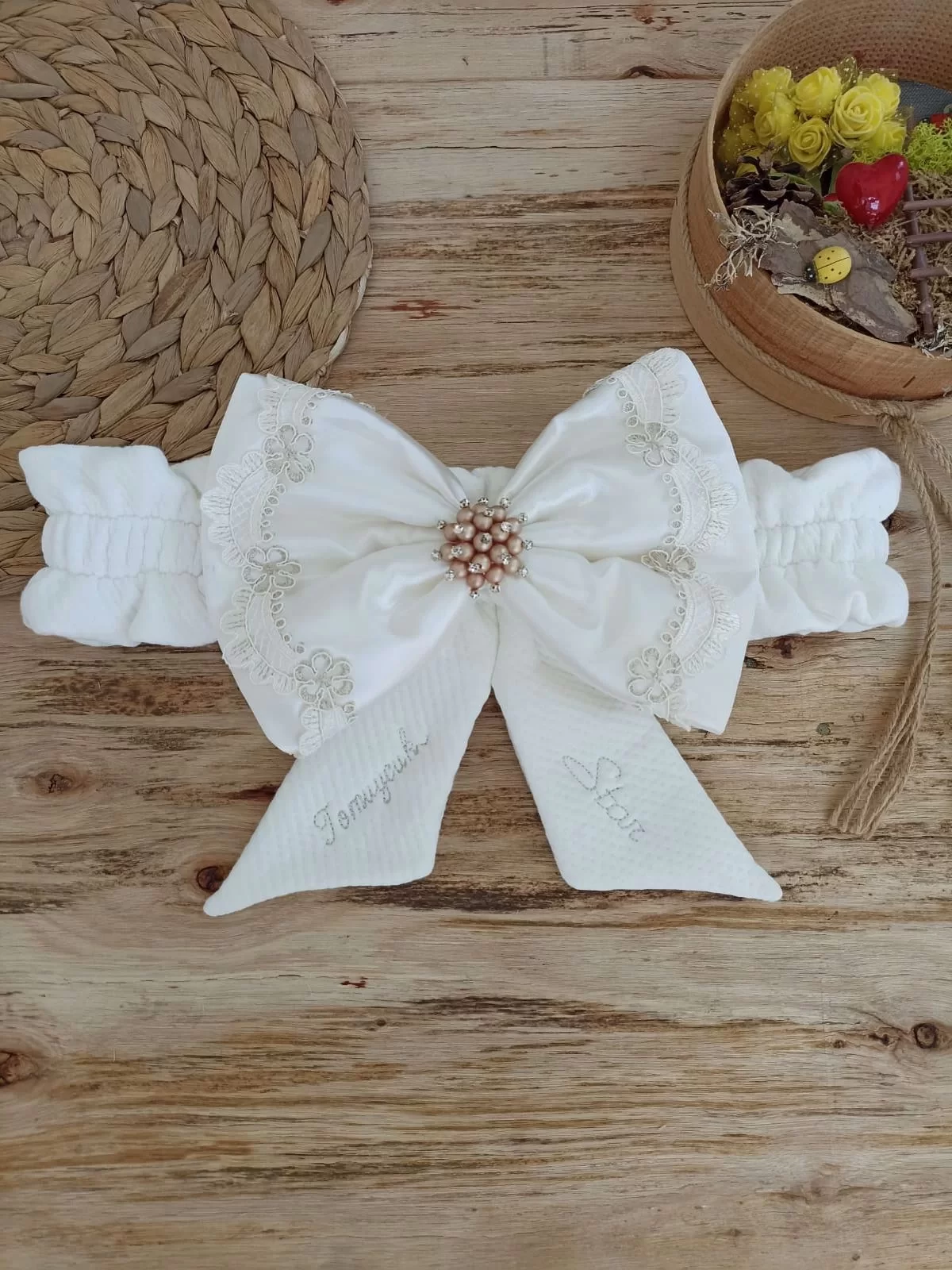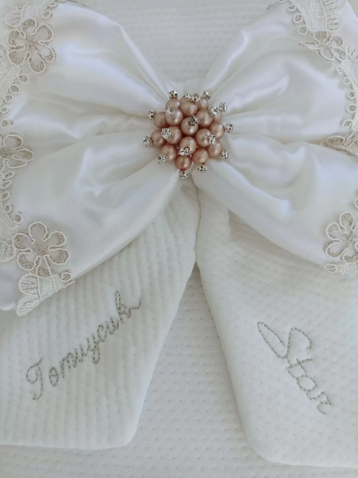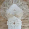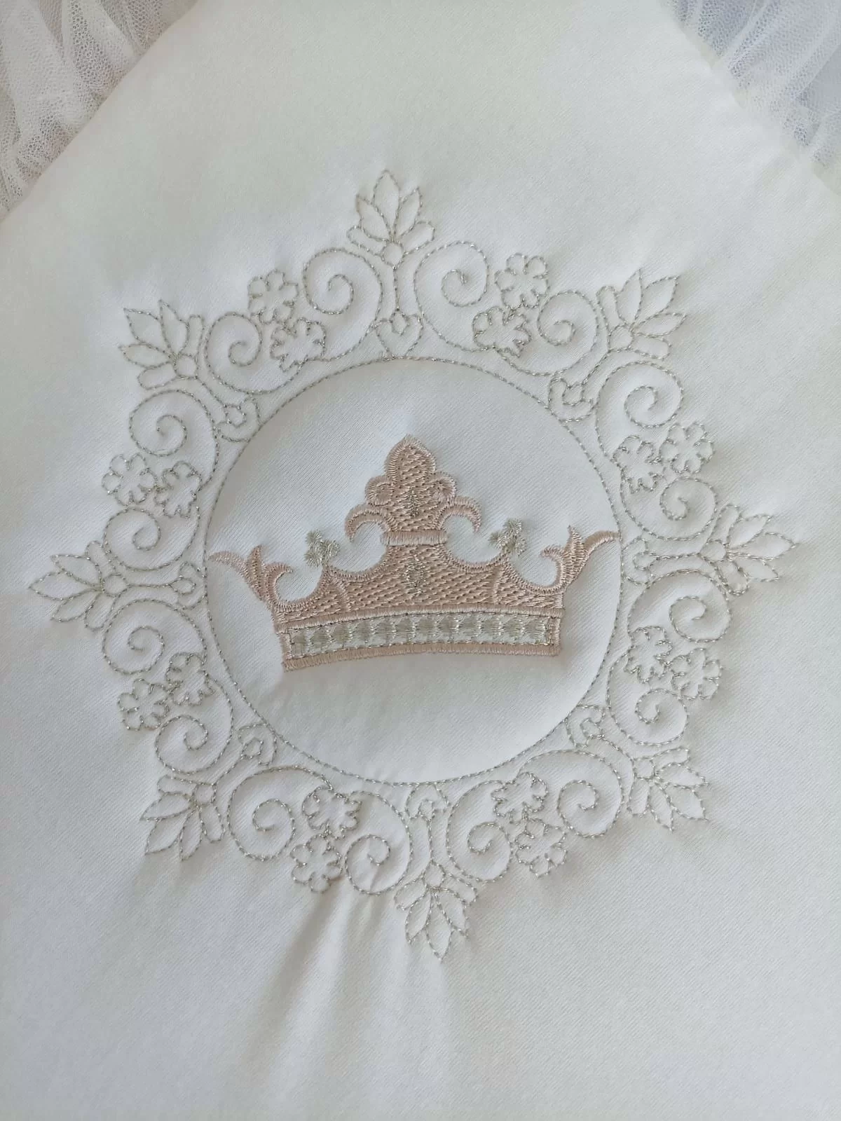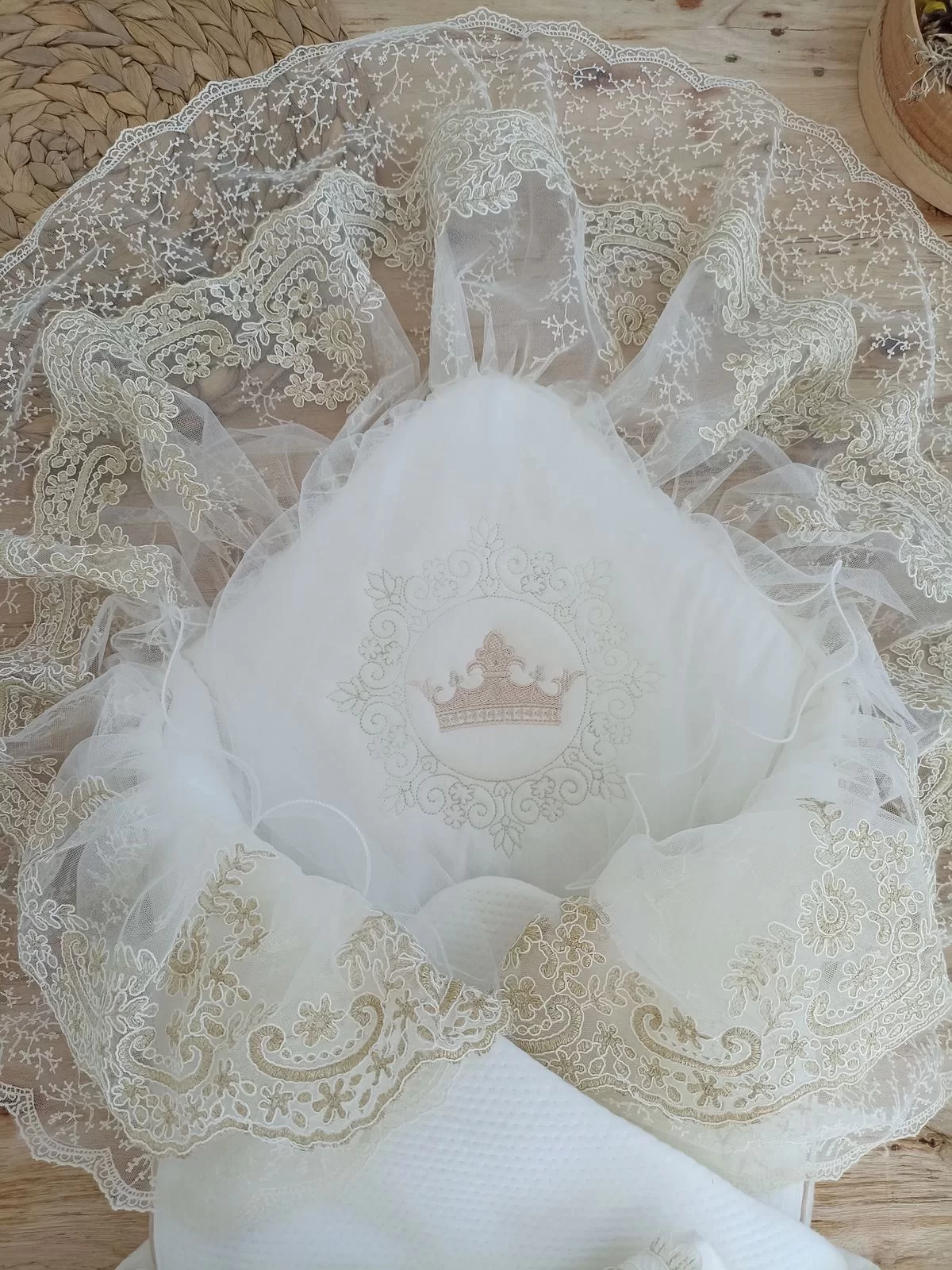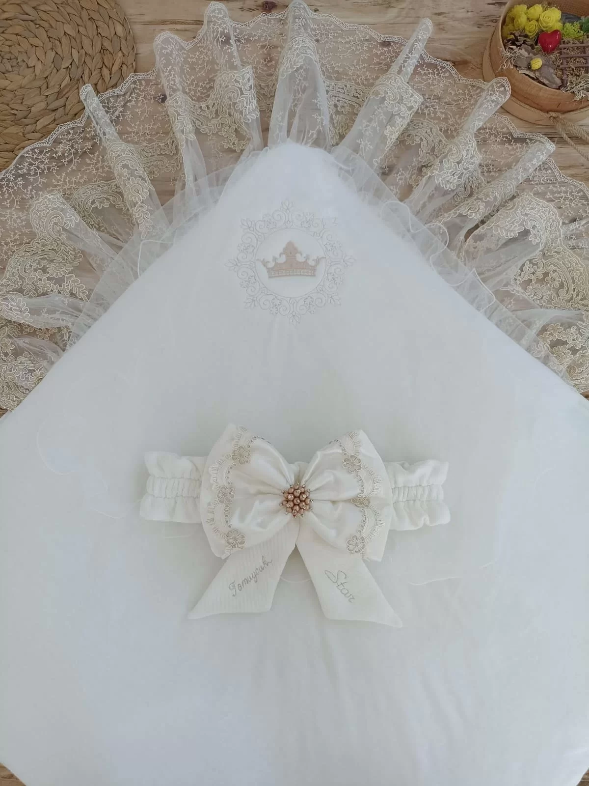 Yenidoğan Sahra Taç Nakışlı Plazma Taşlı Güpürlü Fiyonklu Duvaklı Trilüks Kundak Bebek Battaniyesi