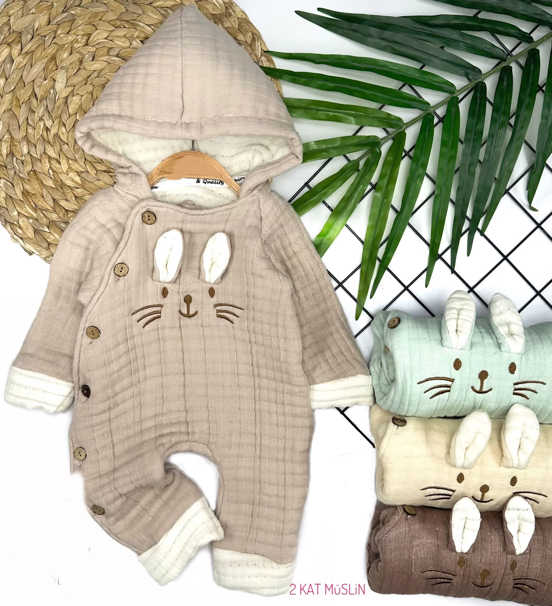 0-3 3-6 Ay Tavşan Nakışlı Düğme Kapamalı Çift Kat Müslin Kumaş Kapşonlu Kız Erkek Bebek Tulumu Kahverengi
