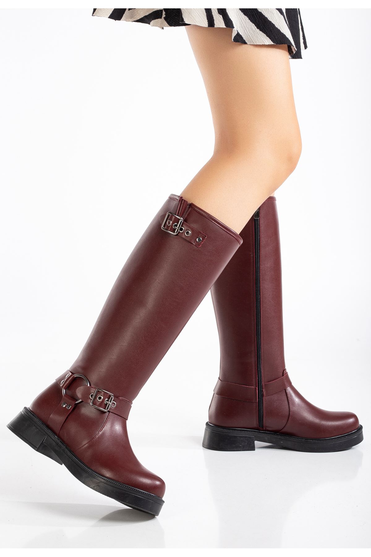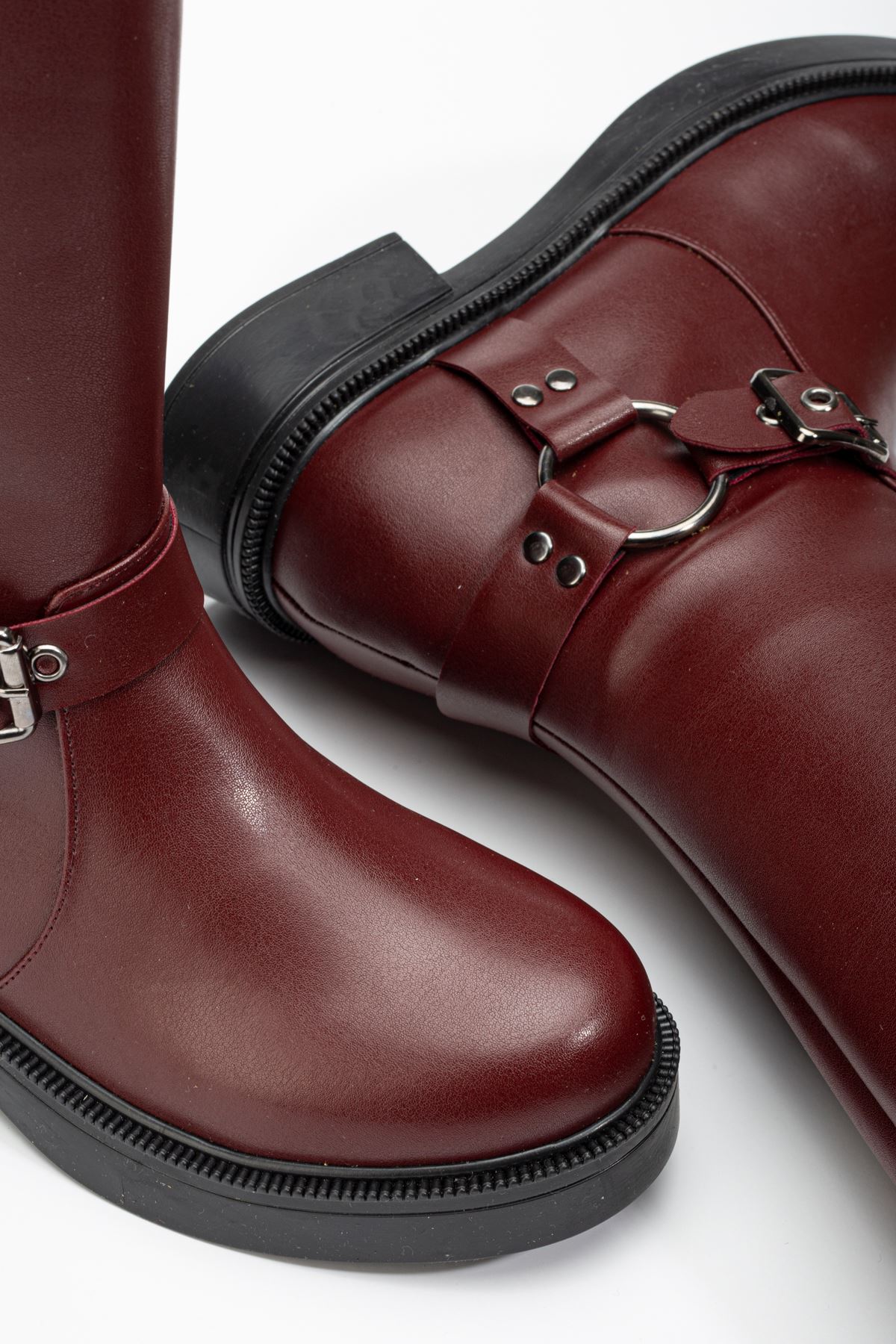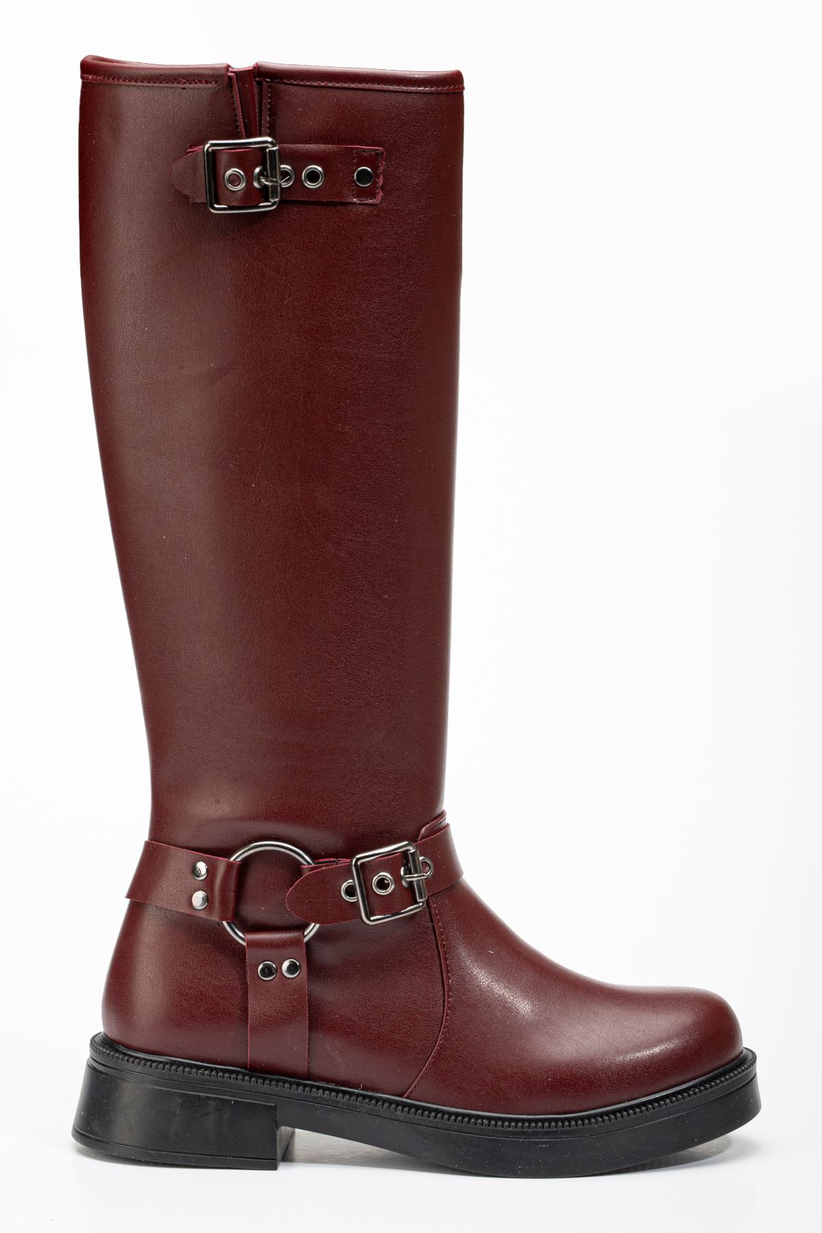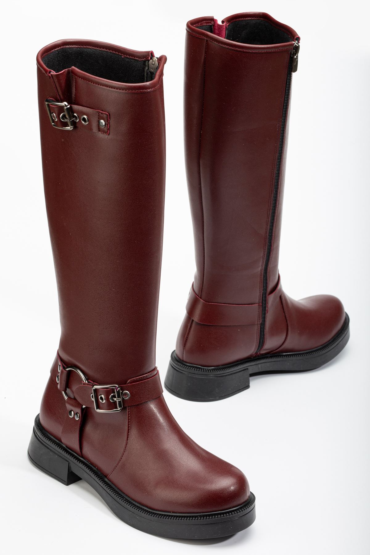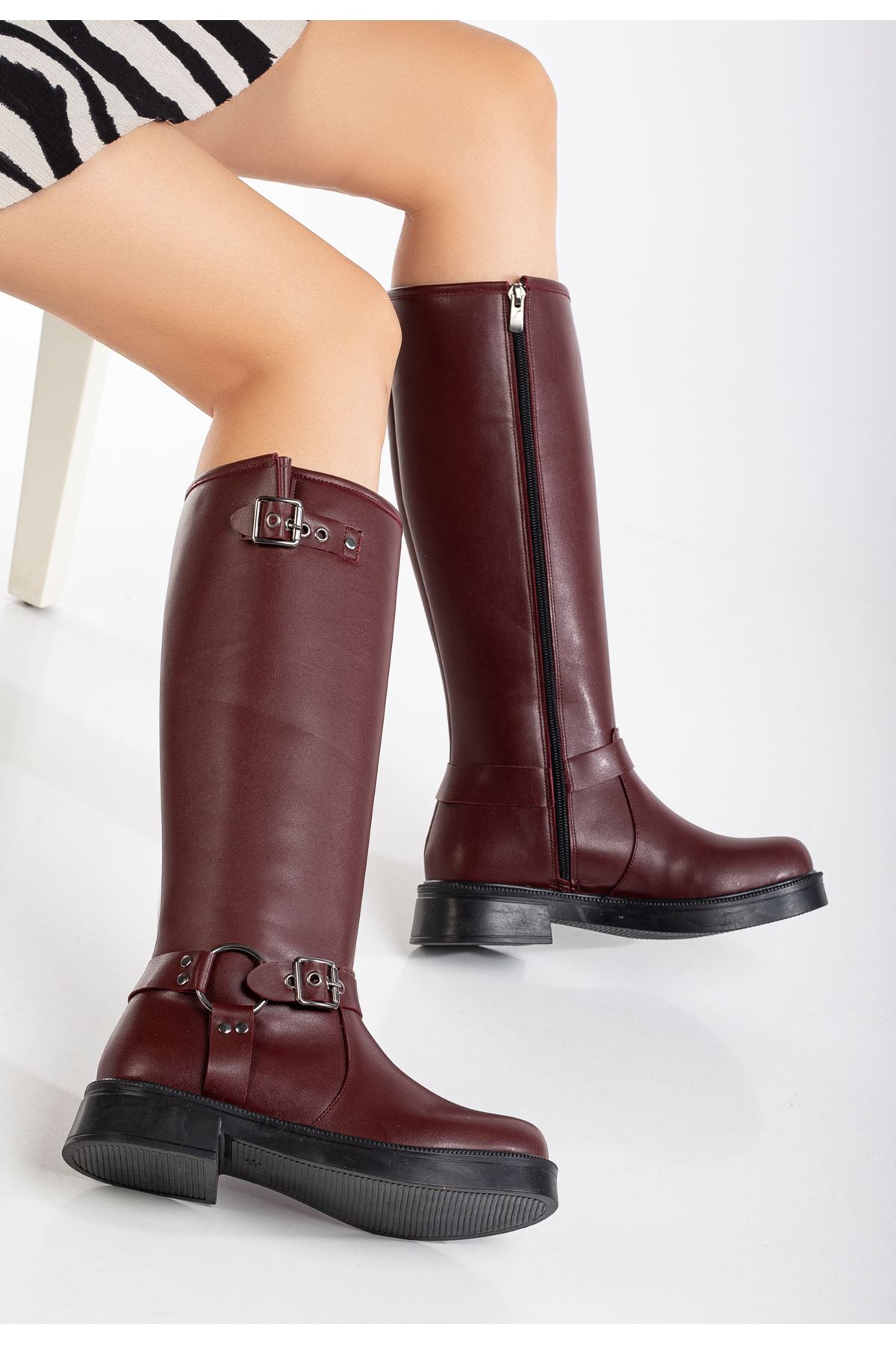 02-312 Bordo Toka Aksesuarlı Fermuarlı Günlük Kadın Çizme