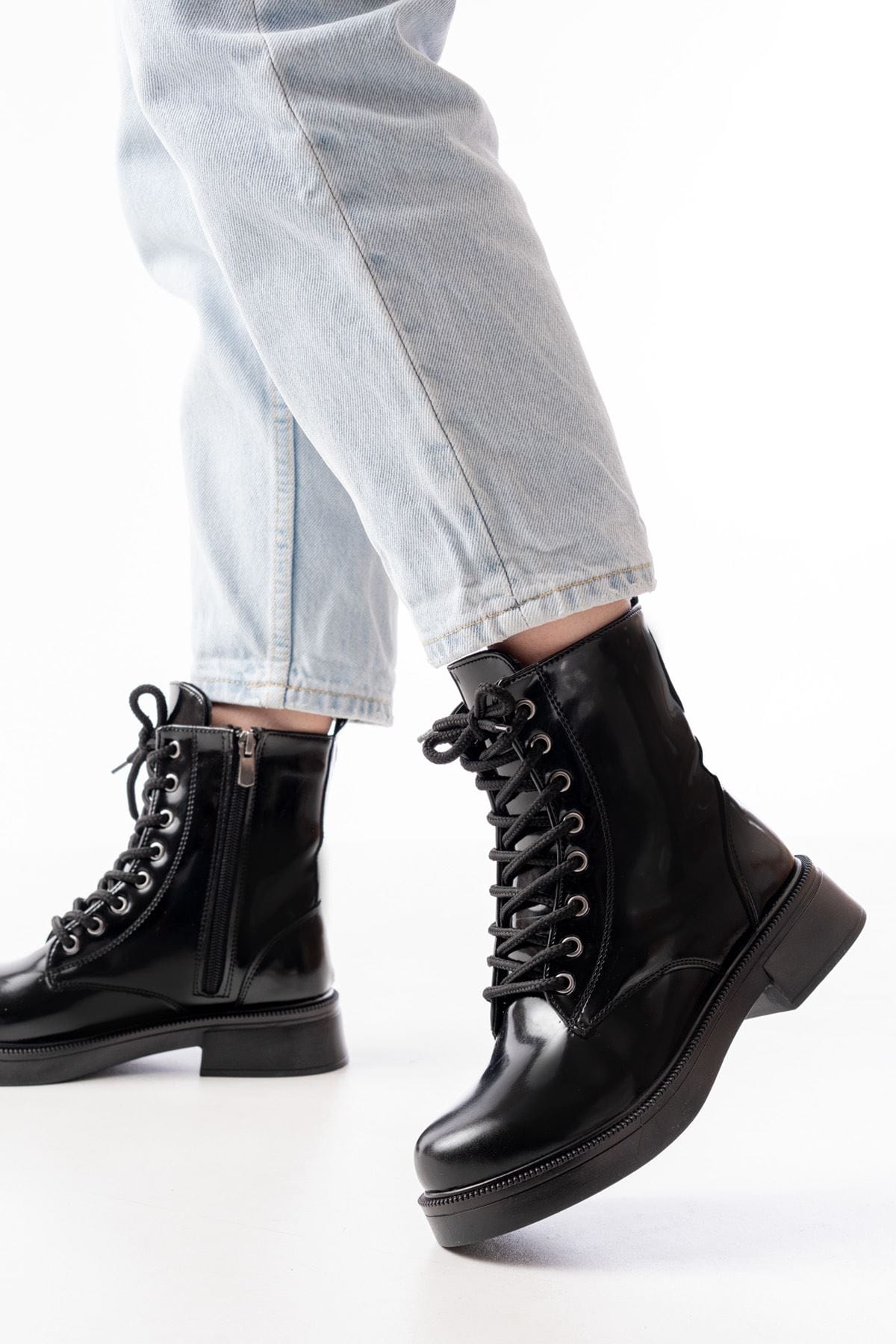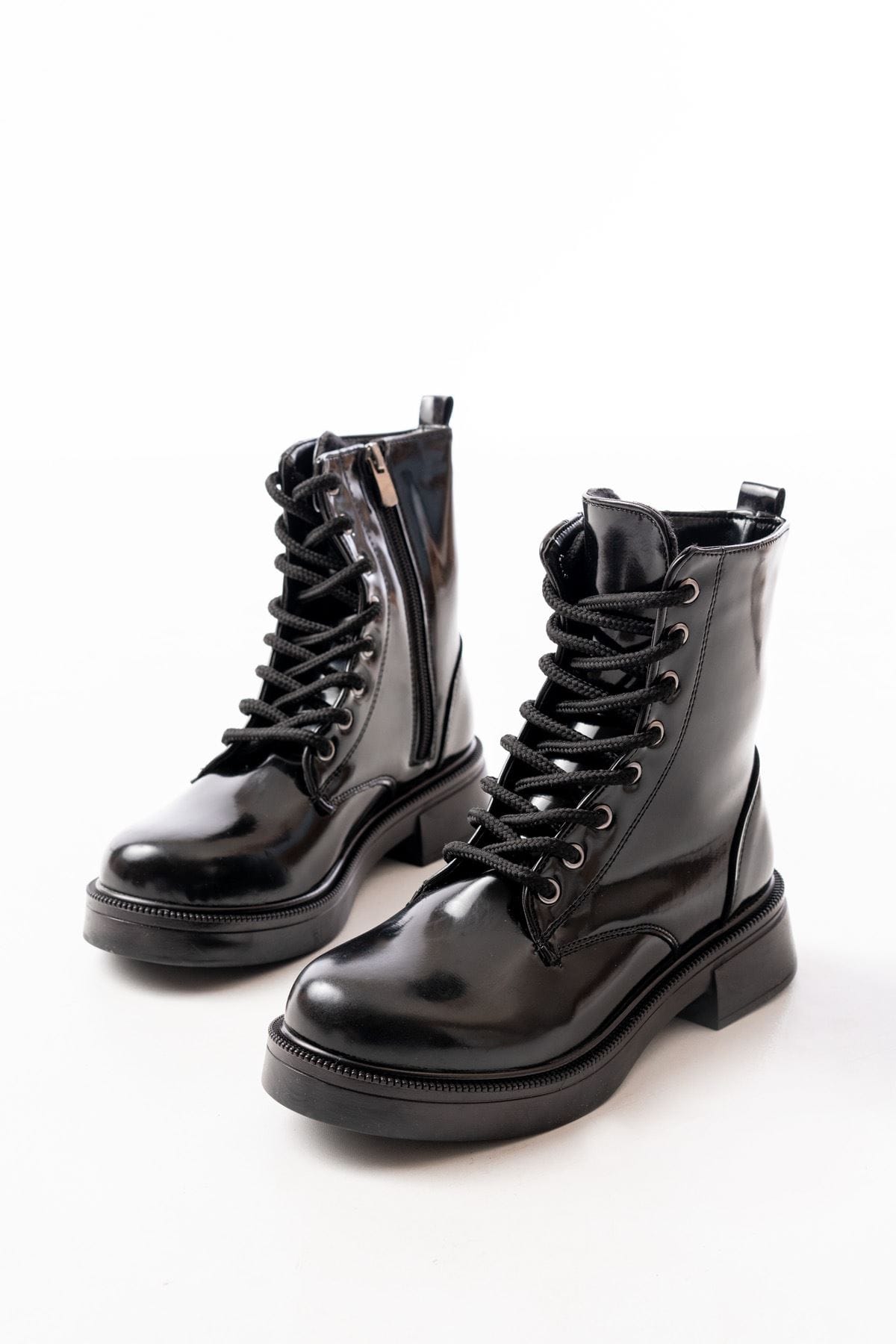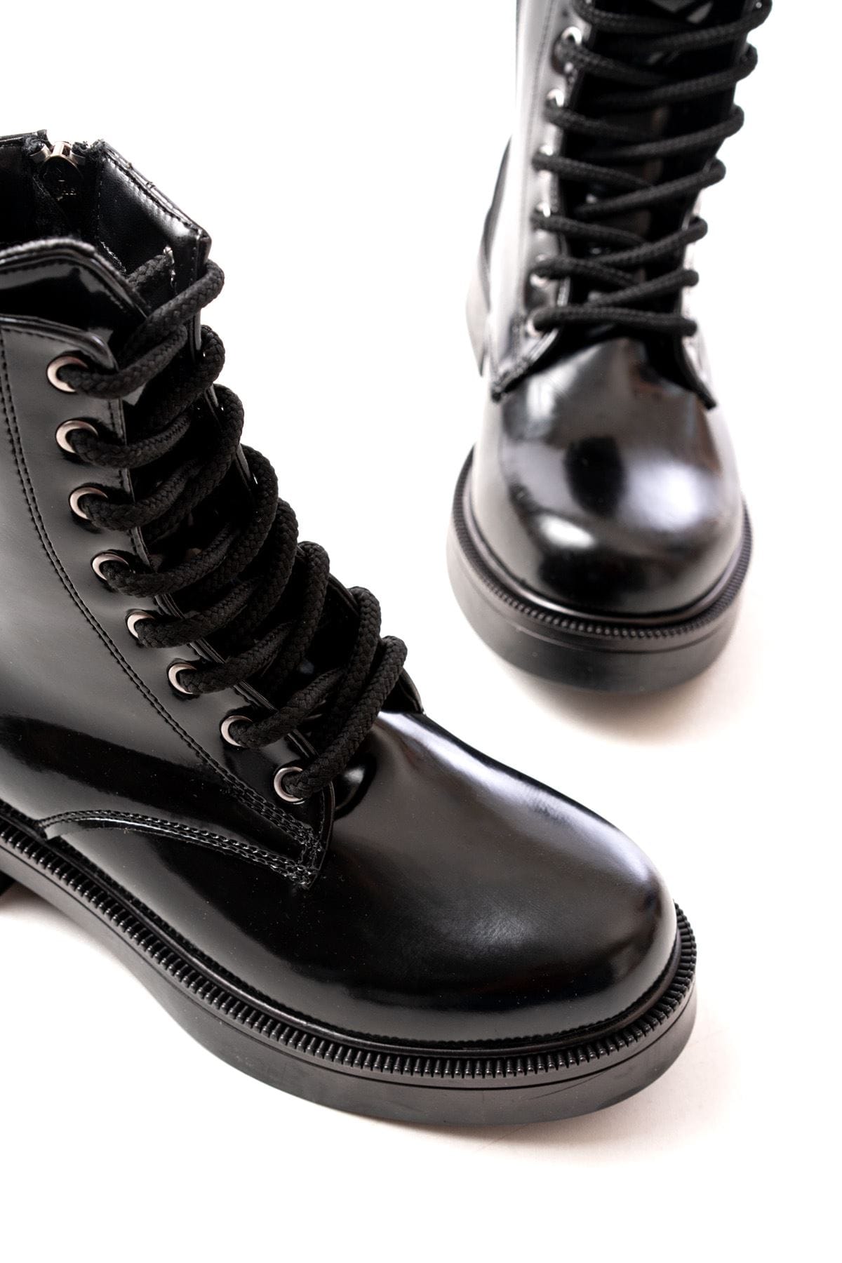 02-356 Siyah Rugan Düz Topuklu Bağcıklı Fermuarlı Günlük Kadın Bot