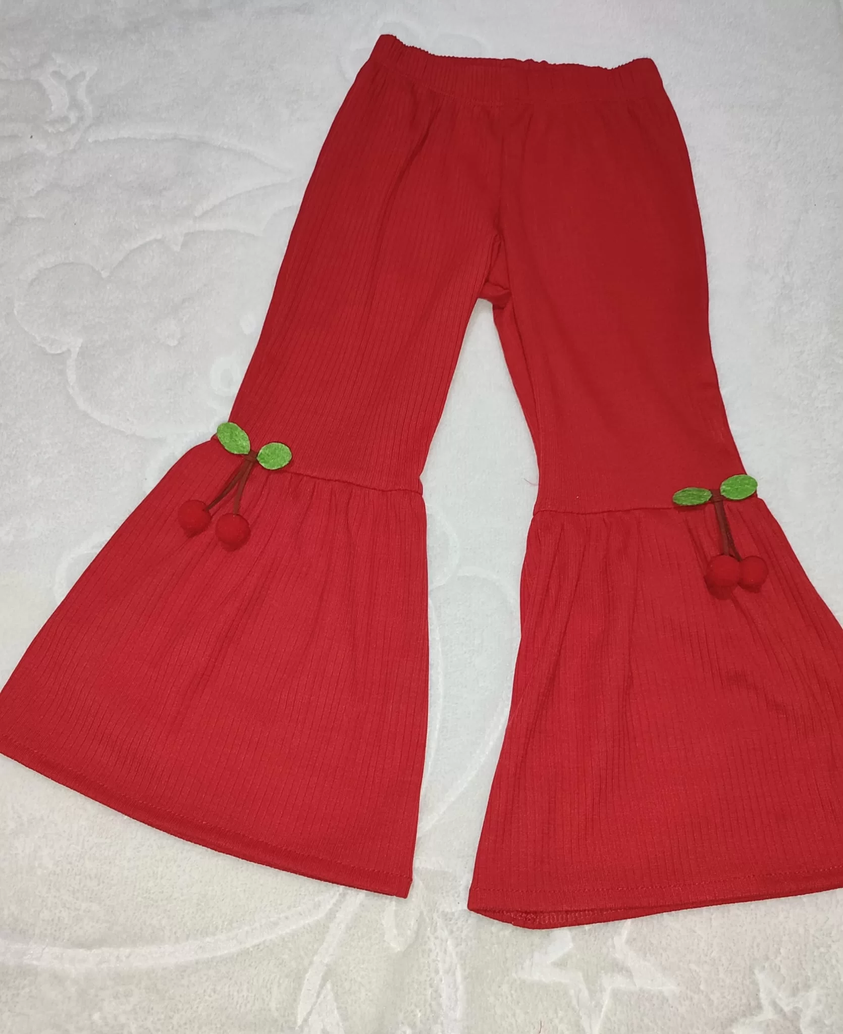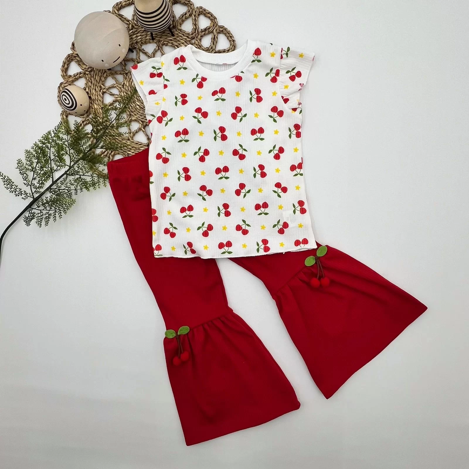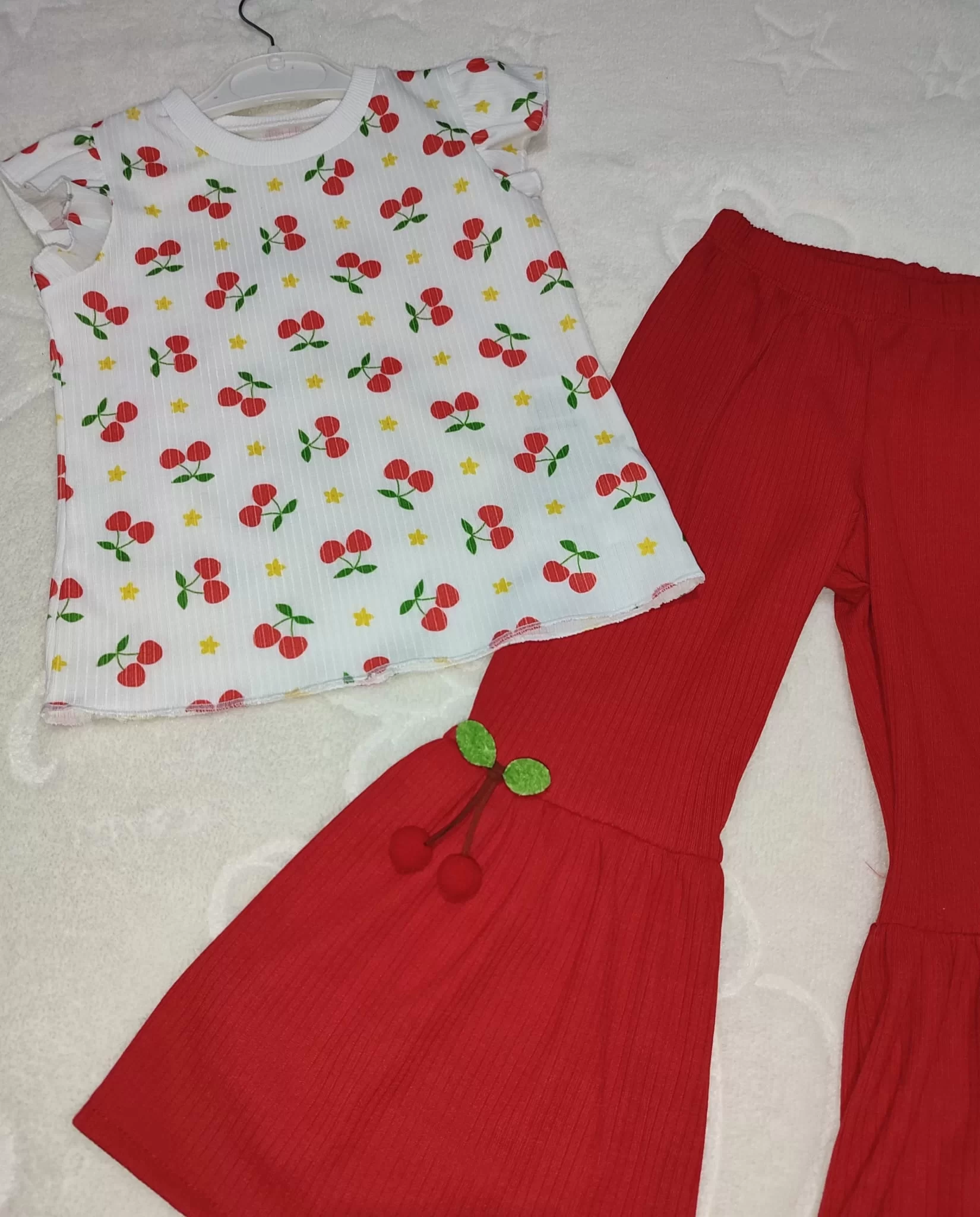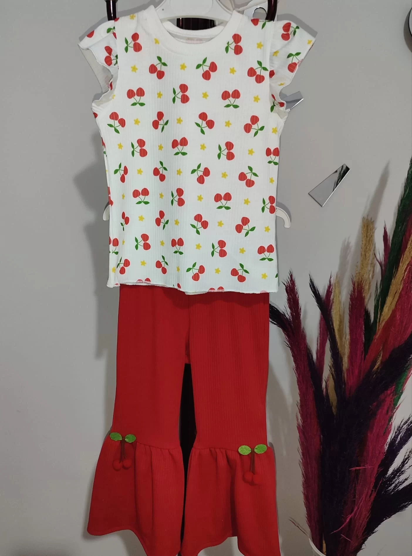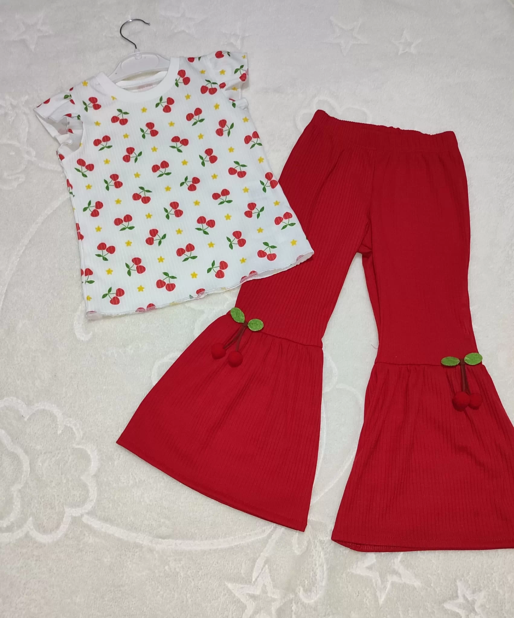 1-2-3-4 Yaş Kiraz Baskılı Tişört İspanyol Paçalı Likralı 2li Kız Çocuk Takımı