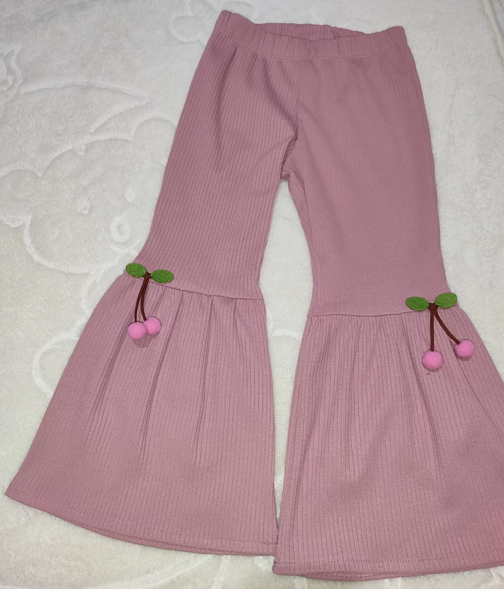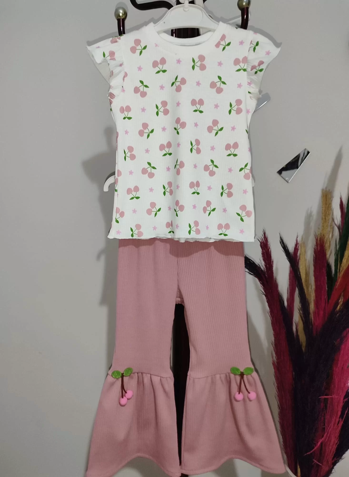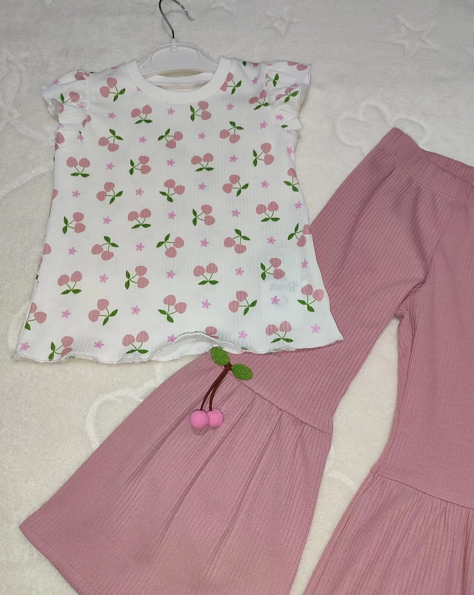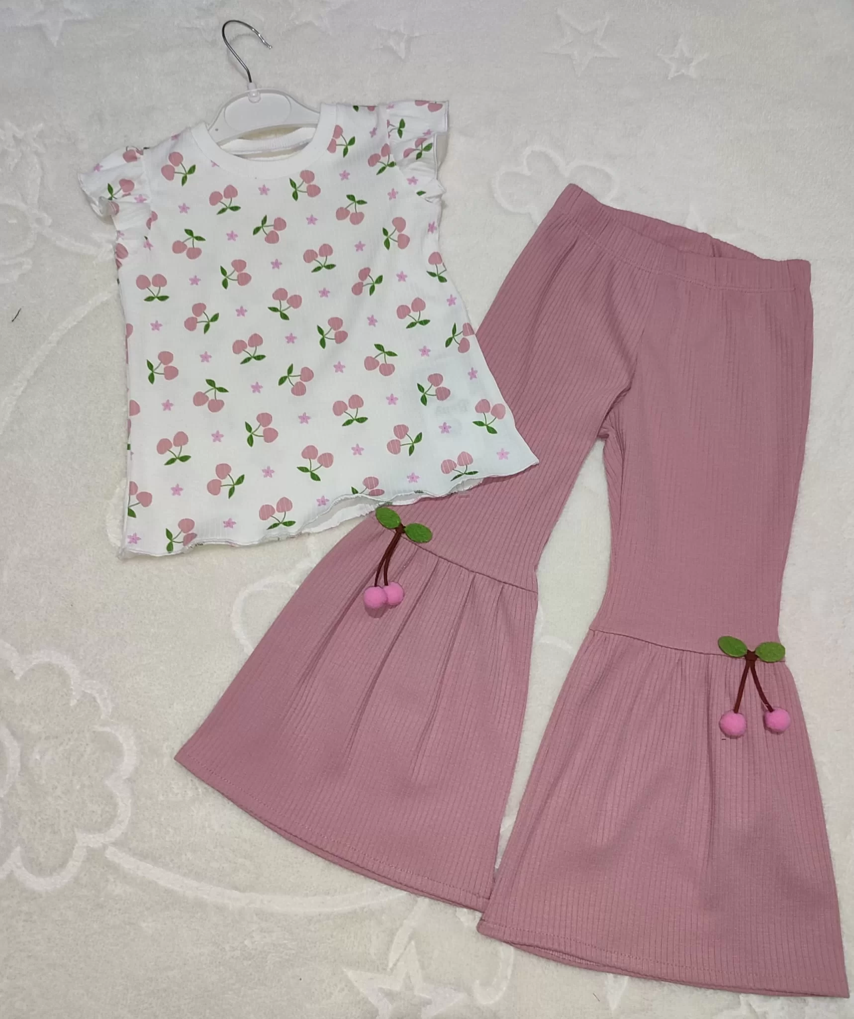 1-2-3-4 Yaş Kiraz Baskılı Tişört İspanyol Paçalı Likralı 2li Kız Çocuk Takımı Gül Kurusu