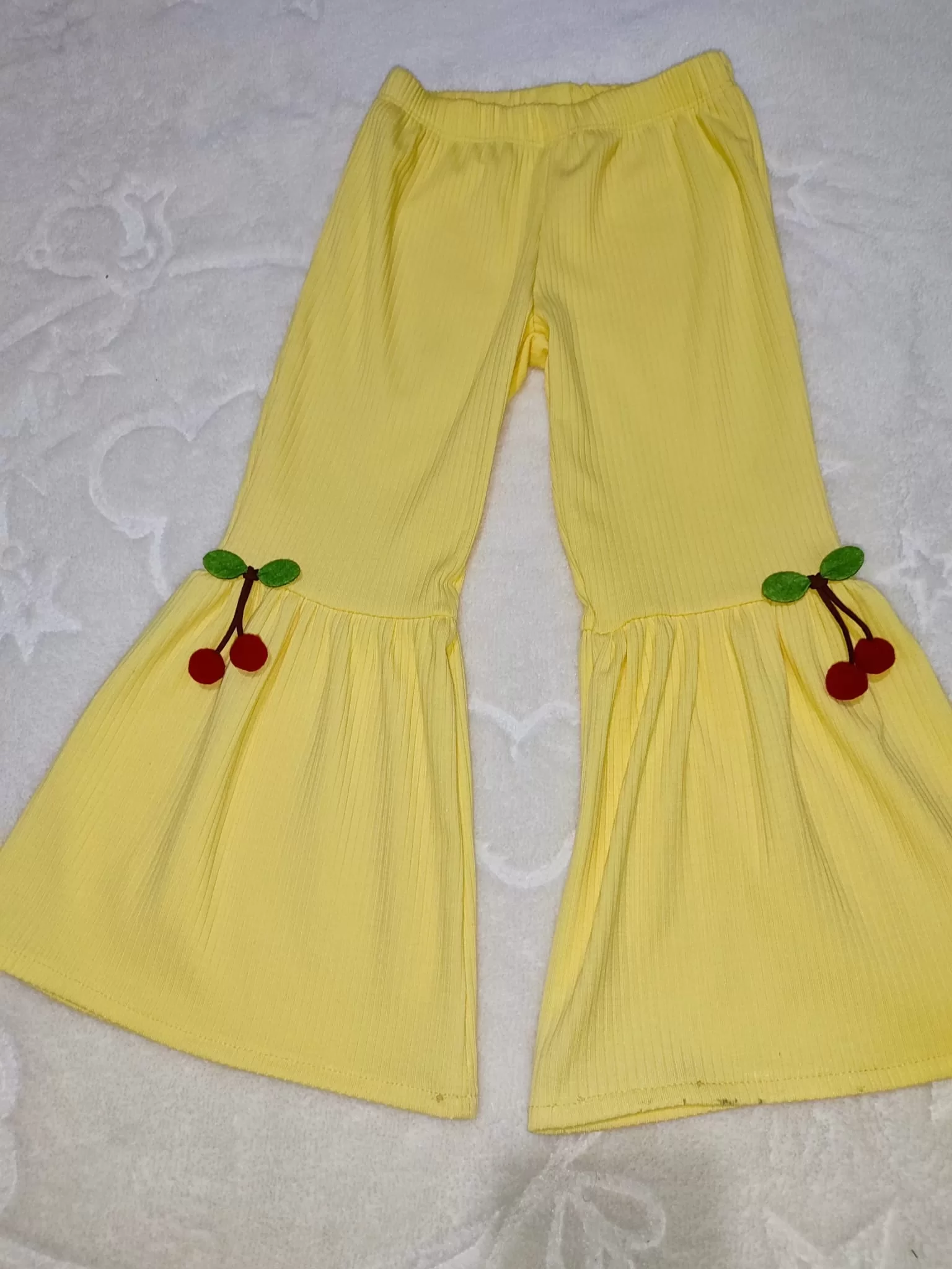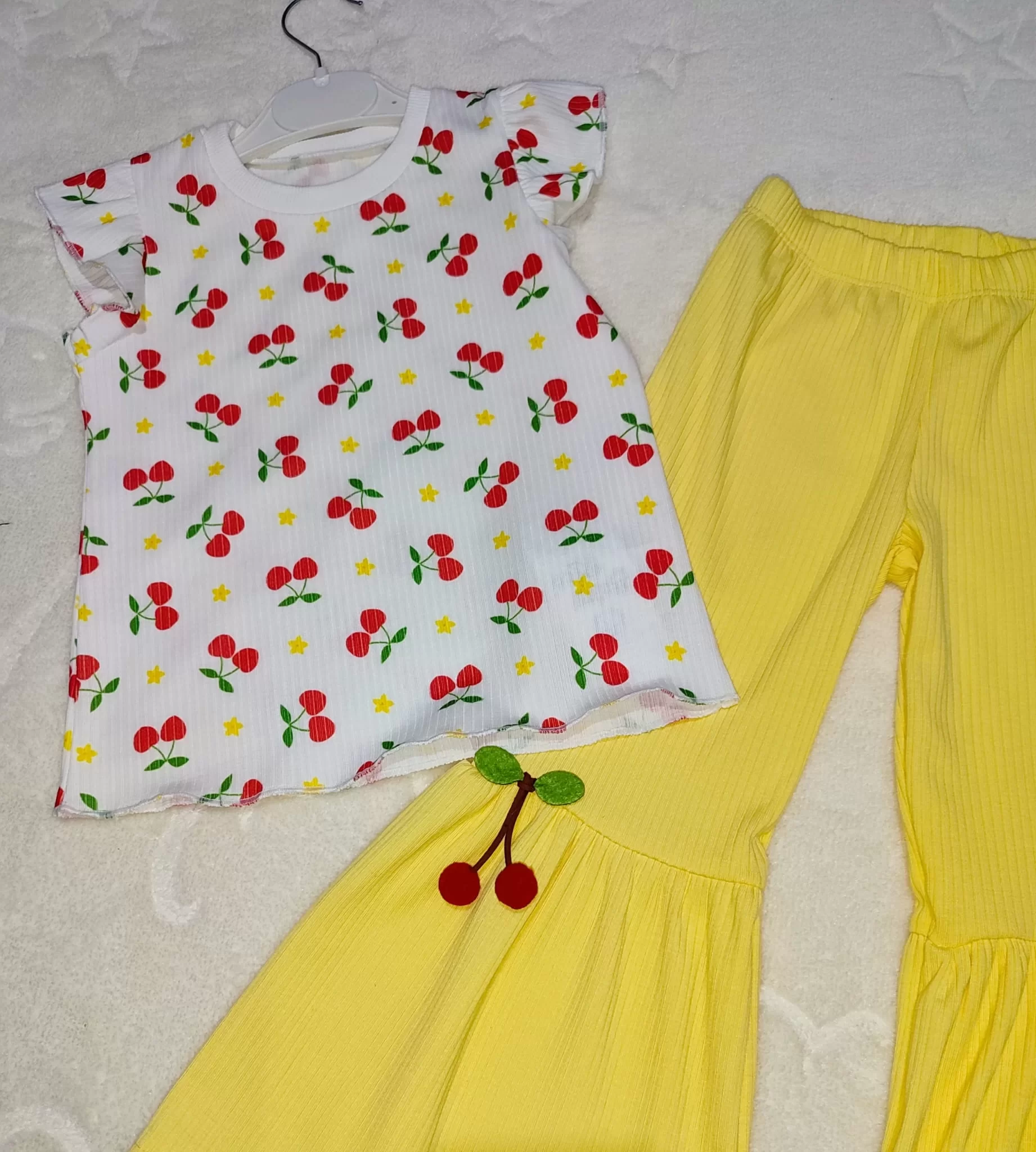 1-2-3-4 Yaş Kiraz Baskılı Tişört İspanyol Paçalı Likralı 2li Kız Çocuk Takımı Sarı
