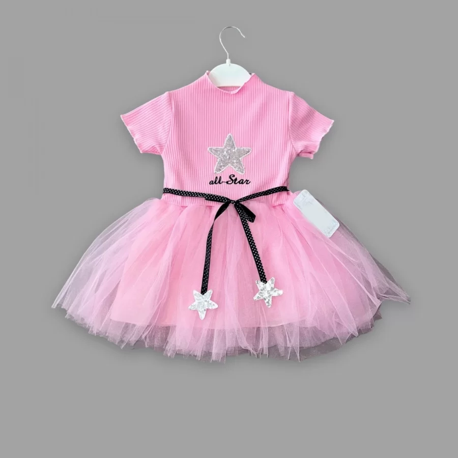 1-2-3 Yaş All Star Payetli Yıldız Nakışlı Astarlı Kız Bebek Elbisesi