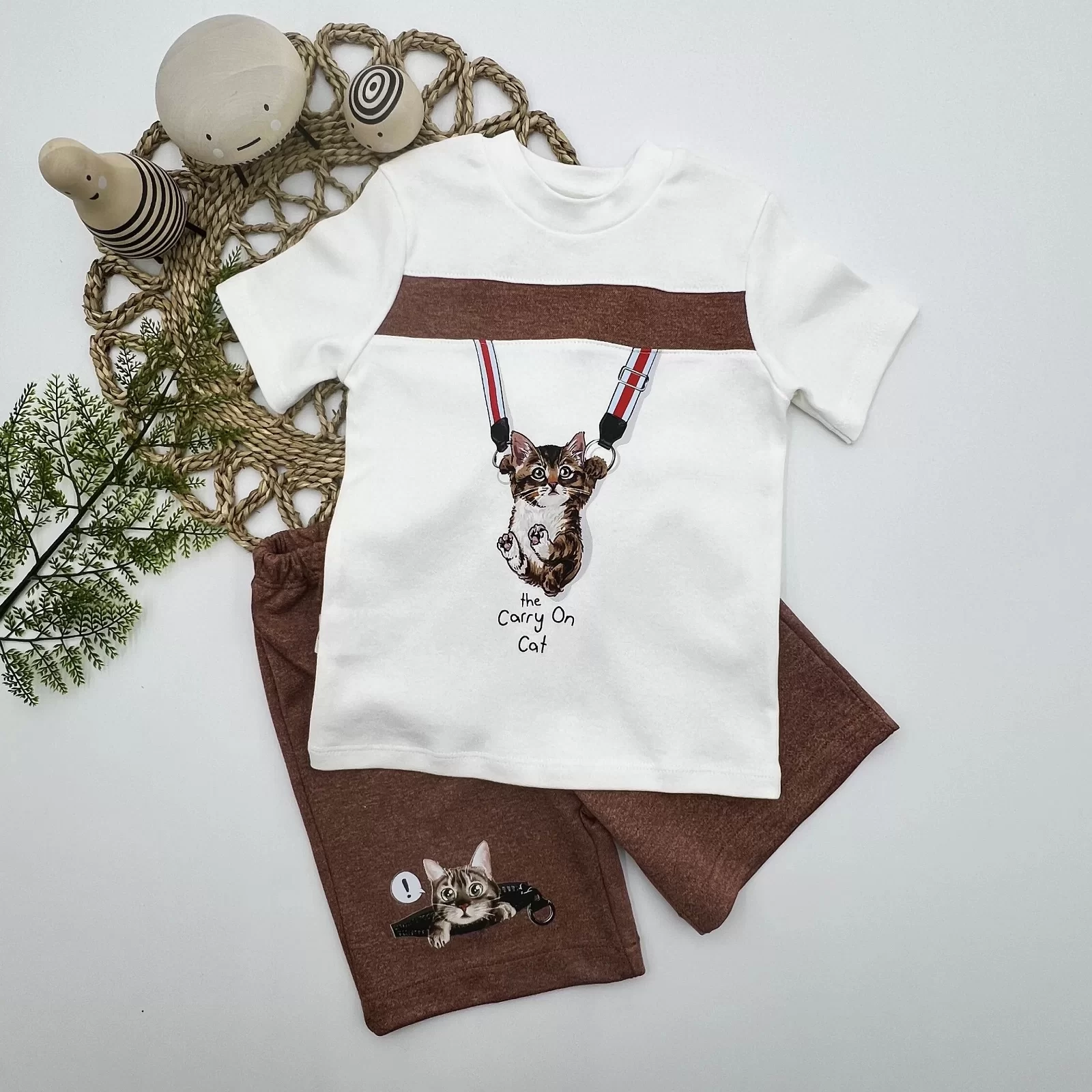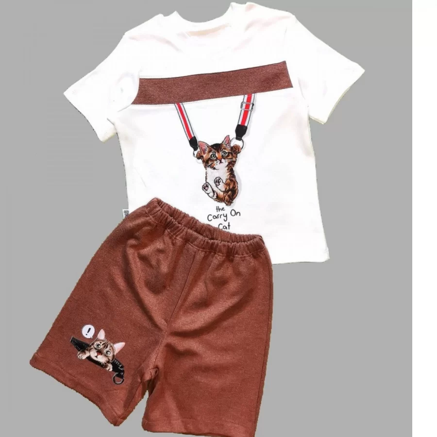 1-2-3 Yaş Fermuarlı Kedi Baskılı Şortlu Kısa Kollu Tişört 2li Erkek Bebek Takımı