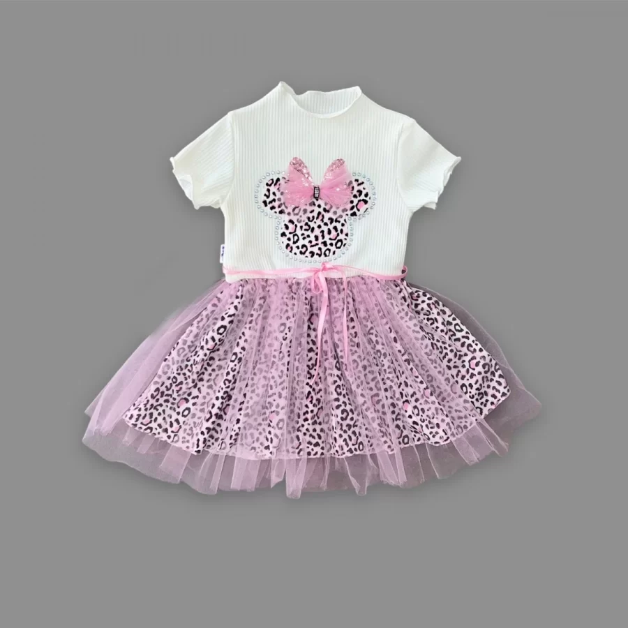 / 1-2-3 Yaş Fiyonklu Mickey Astarlı Etekli Kız Bebek Tütü Elbisesi Pembe-ekru
