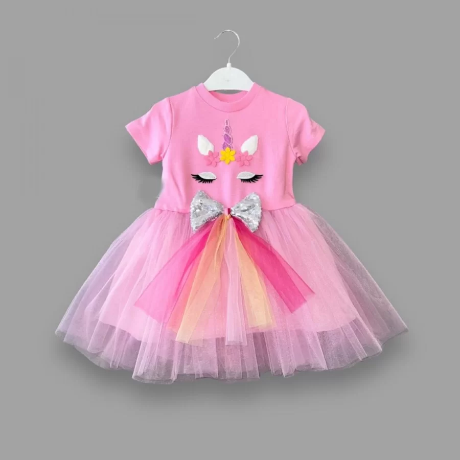 / 1-2-3 Yaş Gökkuşağı Kuyruklu Payet Pony Nakışlı Kız Bebek Tütü Elbisesi Pembe