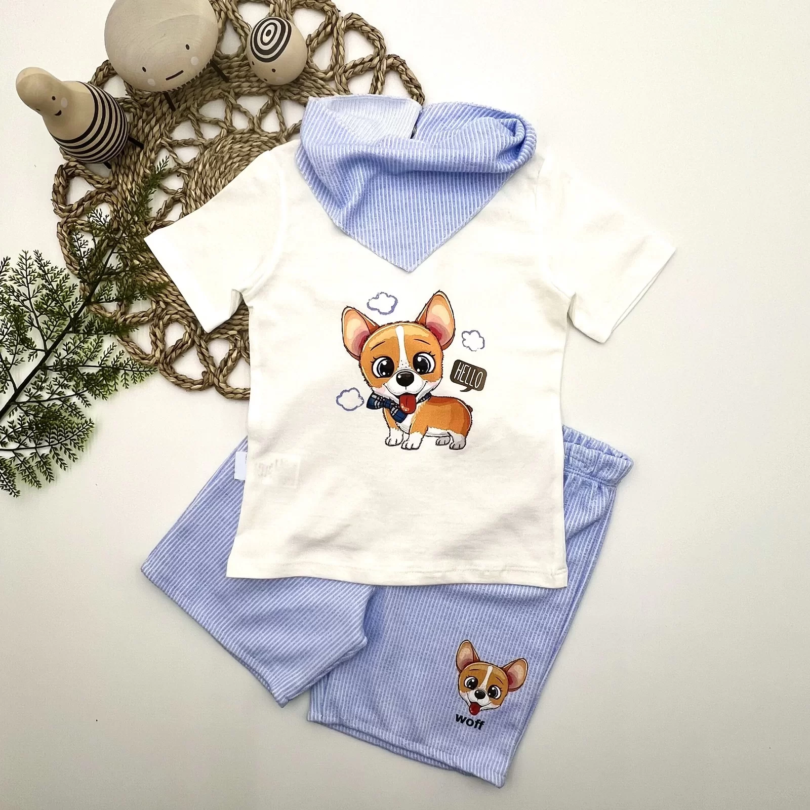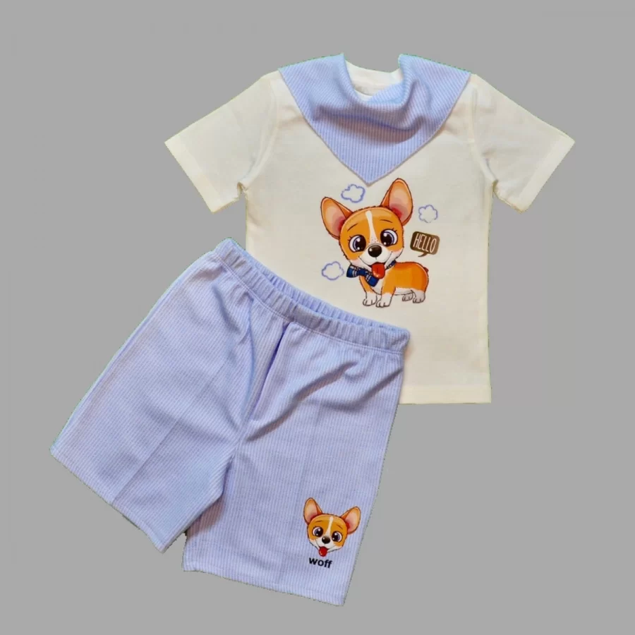 1-2-3 Yaş Köpekçik Baskılı Flarlı Şortlu Kısa Kollu Tişört 3lü Erkek Bebek Takımı Ekru