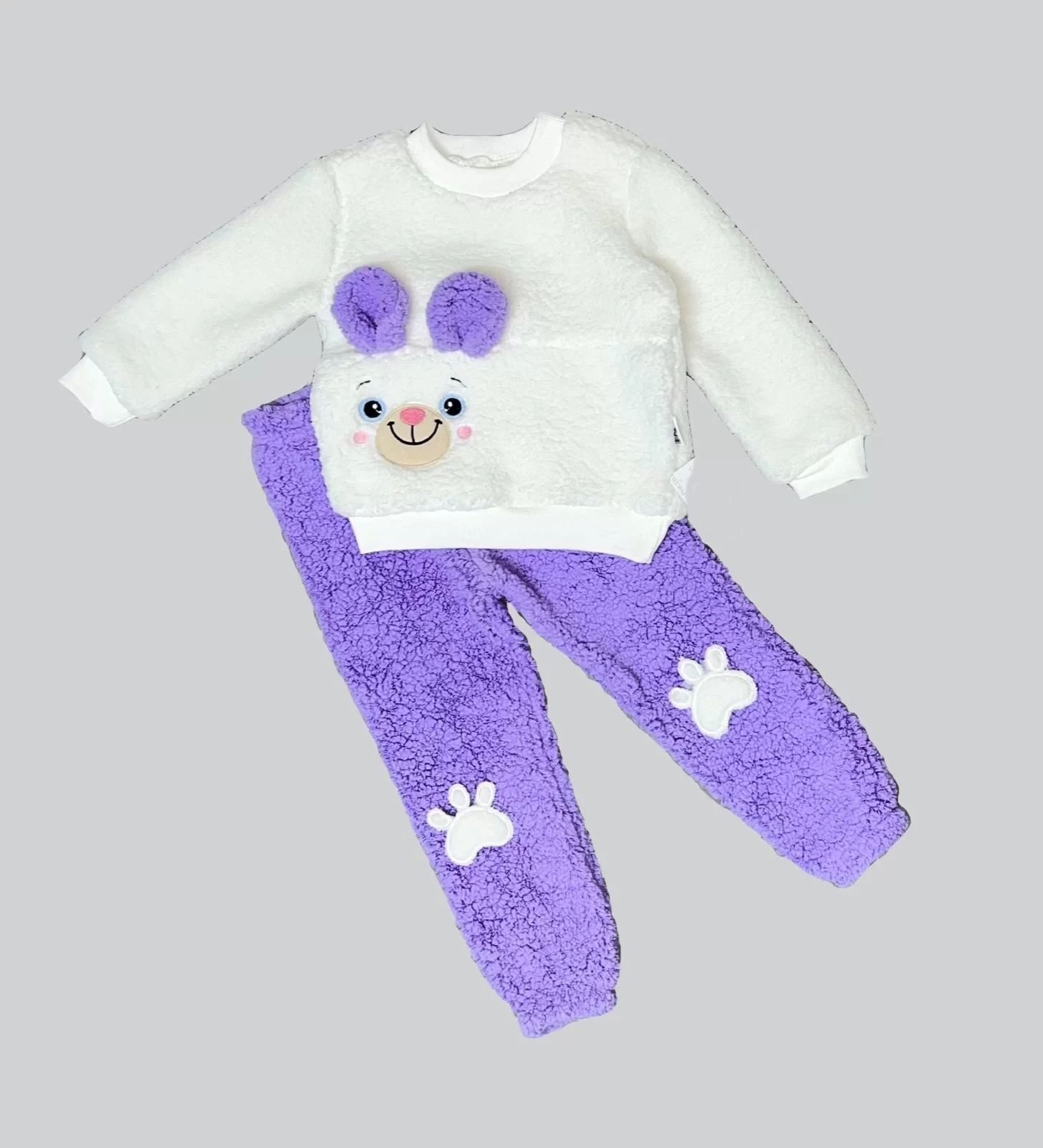 1-2-3 Yaş Kulaklı Patili Ayıcık Kuzu Kumaş Sweat Patili Pantolon Uzun Kollu Kız Erkek 2 Li Takımı Lila