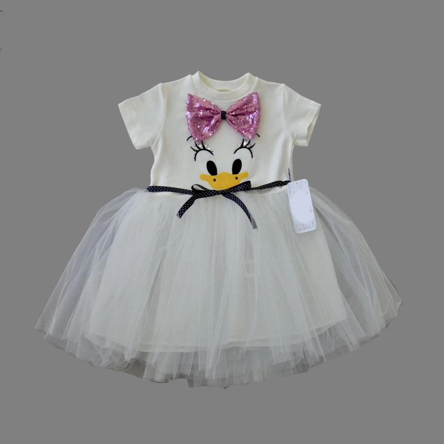 1-2-3 Yaş Payet Fiyonk Tokalı Ördek Nakışlı Astarlı Kız Bebek Tütü Elbisesi Beyaz
