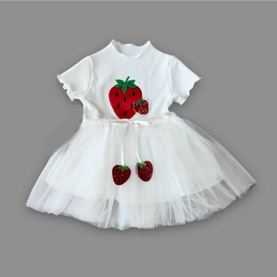 1-2-3 Yaş Payetli Çilek Baskılı Çilek Kuşaklı Kız Bebek Elbisesi