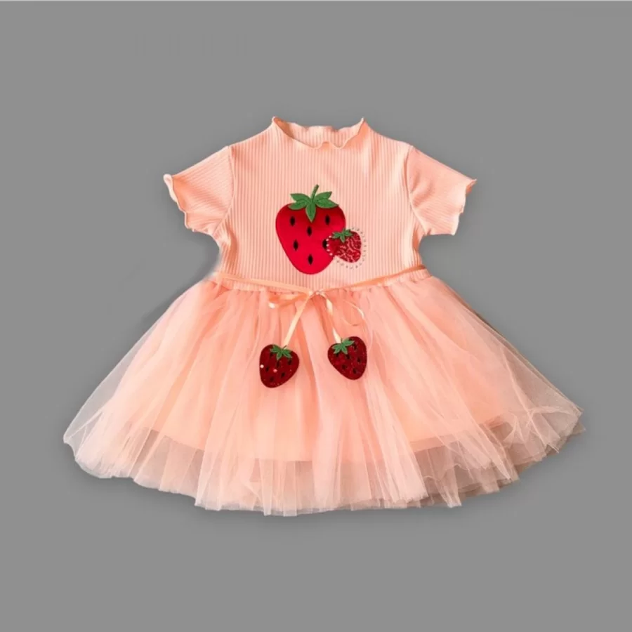 1-2-3 Yaş Payetli Çilek Baskılı Çilek Kuşaklı Kız Bebek Elbisesi