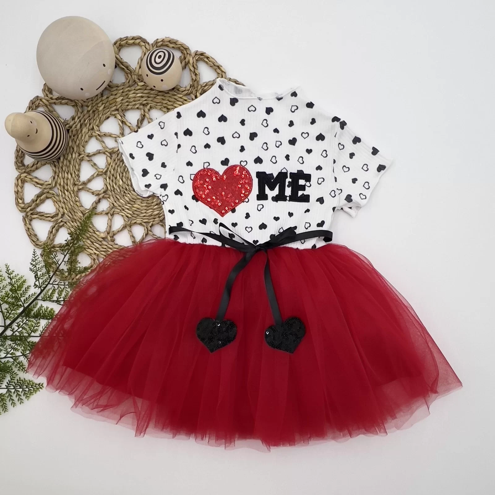 / 1-2-3 Yaş Payetli Kalp Me Baskılı Kız Bebek Elbisesi Kırmızı