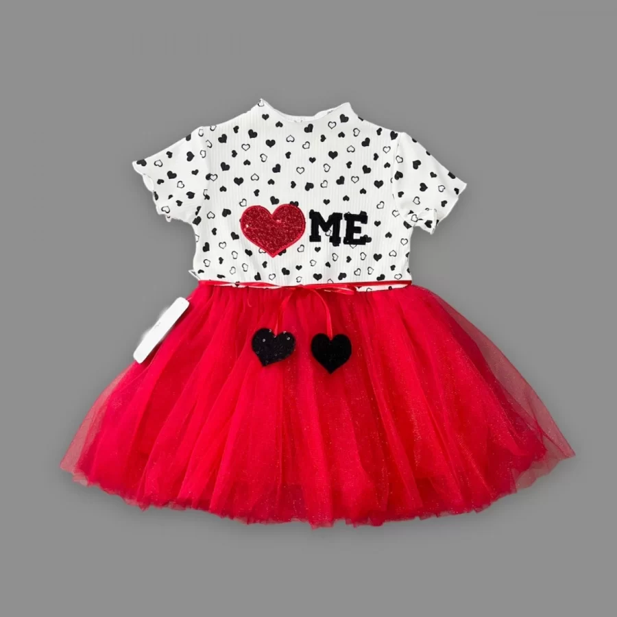 1-2-3 Yaş Payetli Kalp Me Baskılı Kız Bebek Elbisesi Kırmızı adet