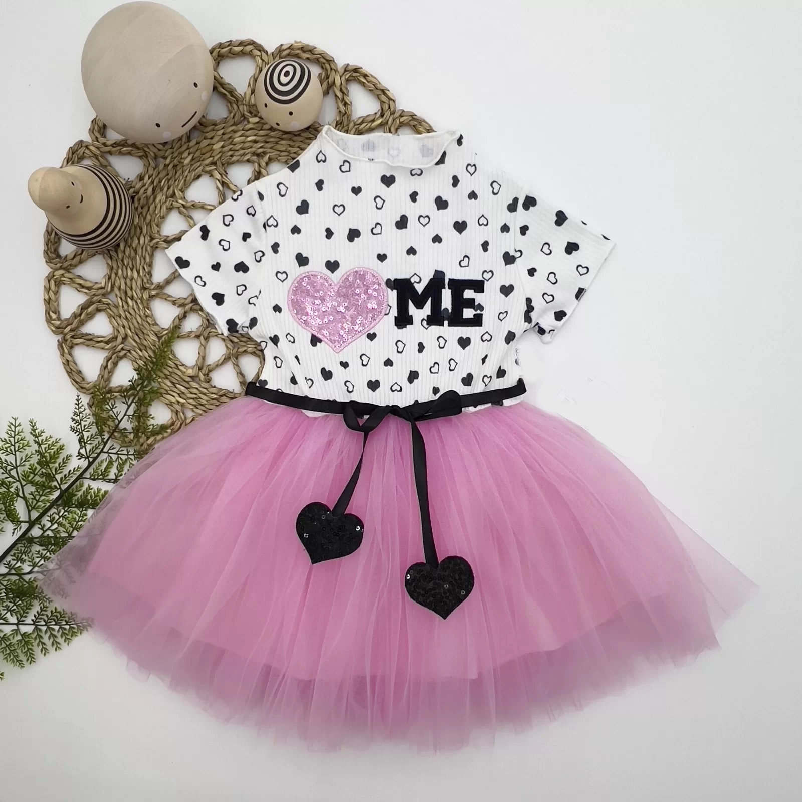 / 1-2-3 Yaş Payetli Kalp Me Baskılı Kız Bebek Elbisesi Pembe