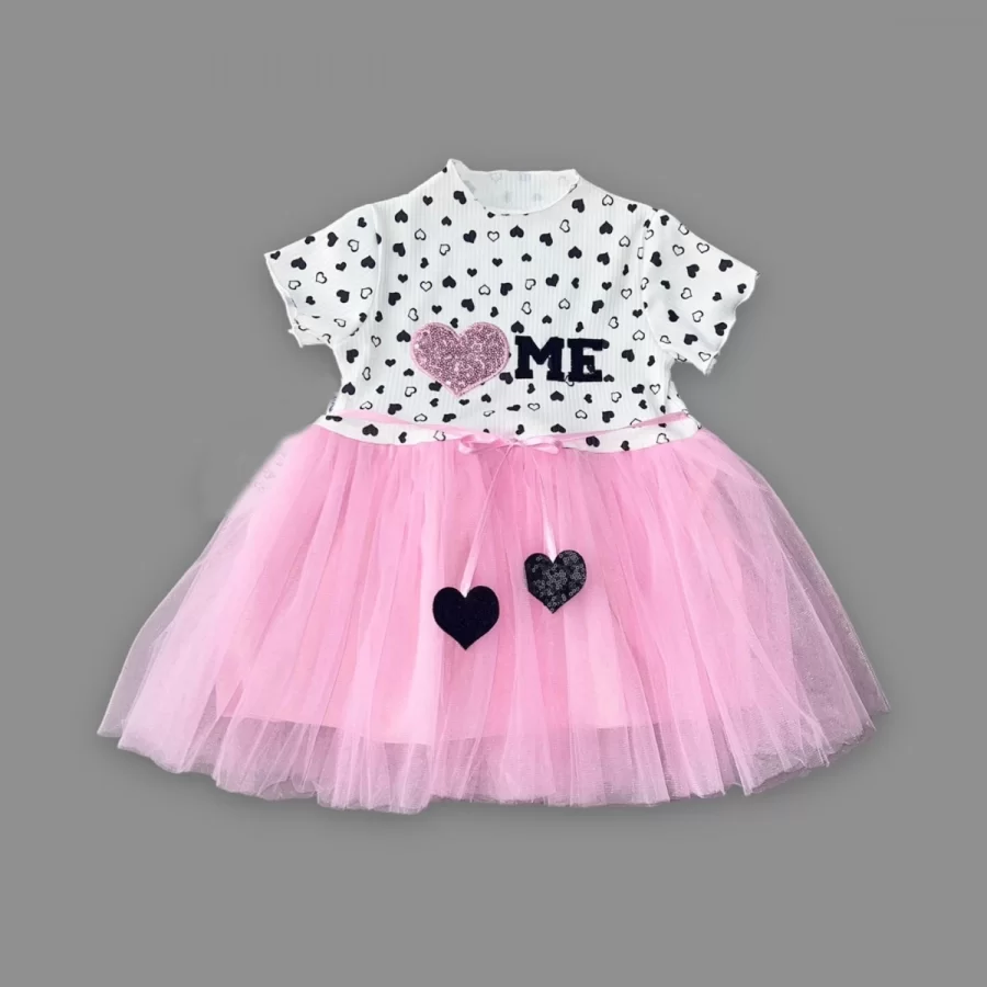 1-2-3 Yaş Payetli Kalp Me Baskılı Kız Bebek Elbisesi Pembe adet