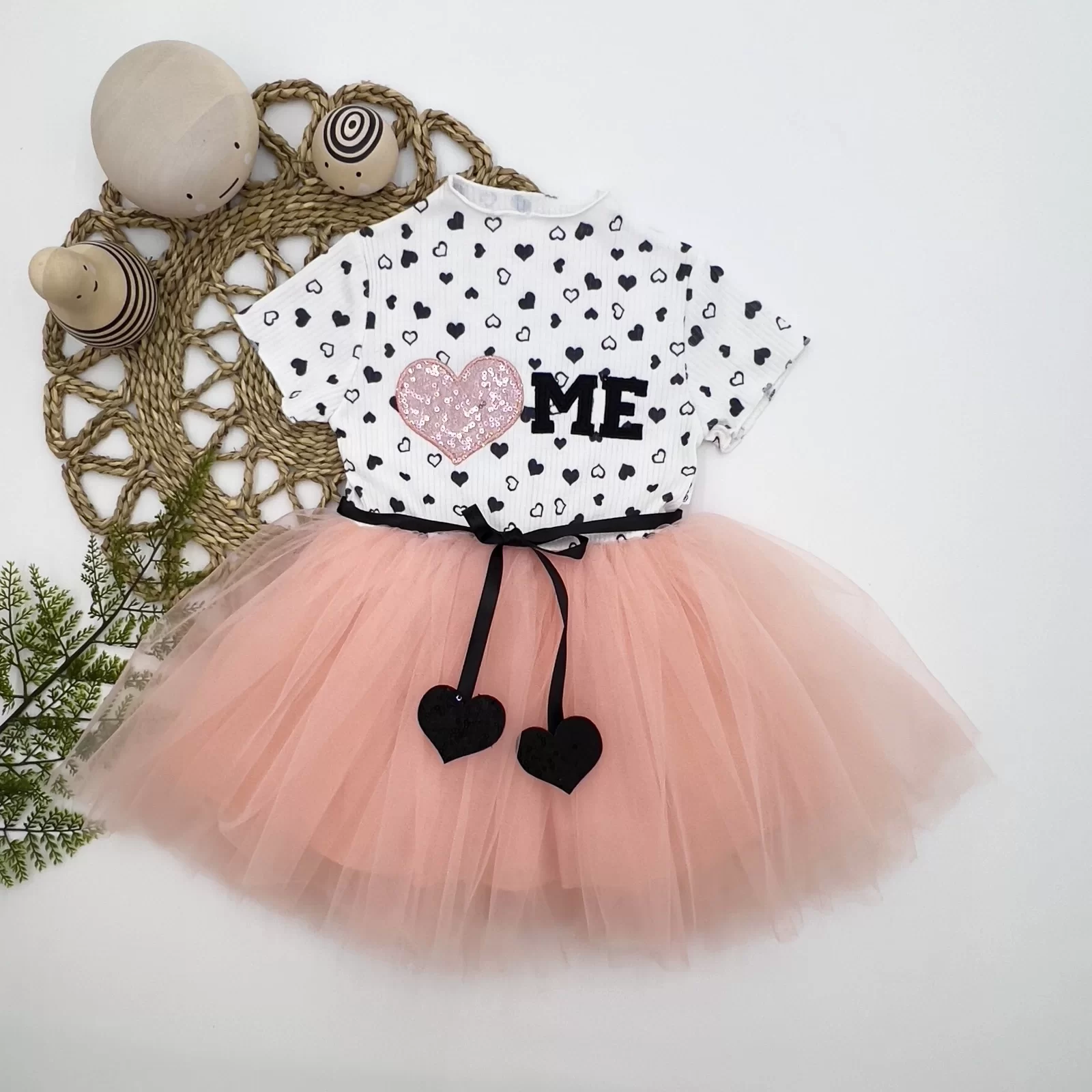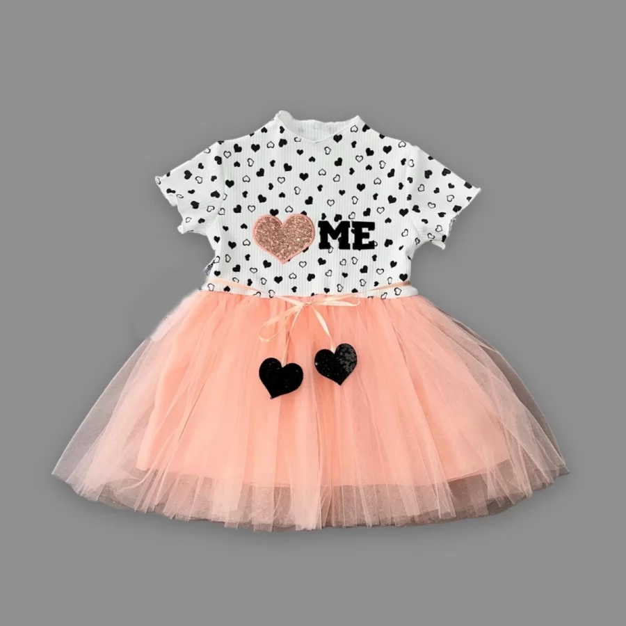 1-2-3 Yaş Payetli Kalp Me Baskılı Kız Bebek Elbisesi Pudra adet