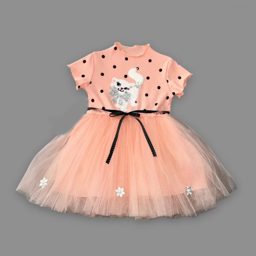 1-2-3 Yaş Payetli Kedicik Baskılı Puantiyeli Kız Bebek Elbisesi