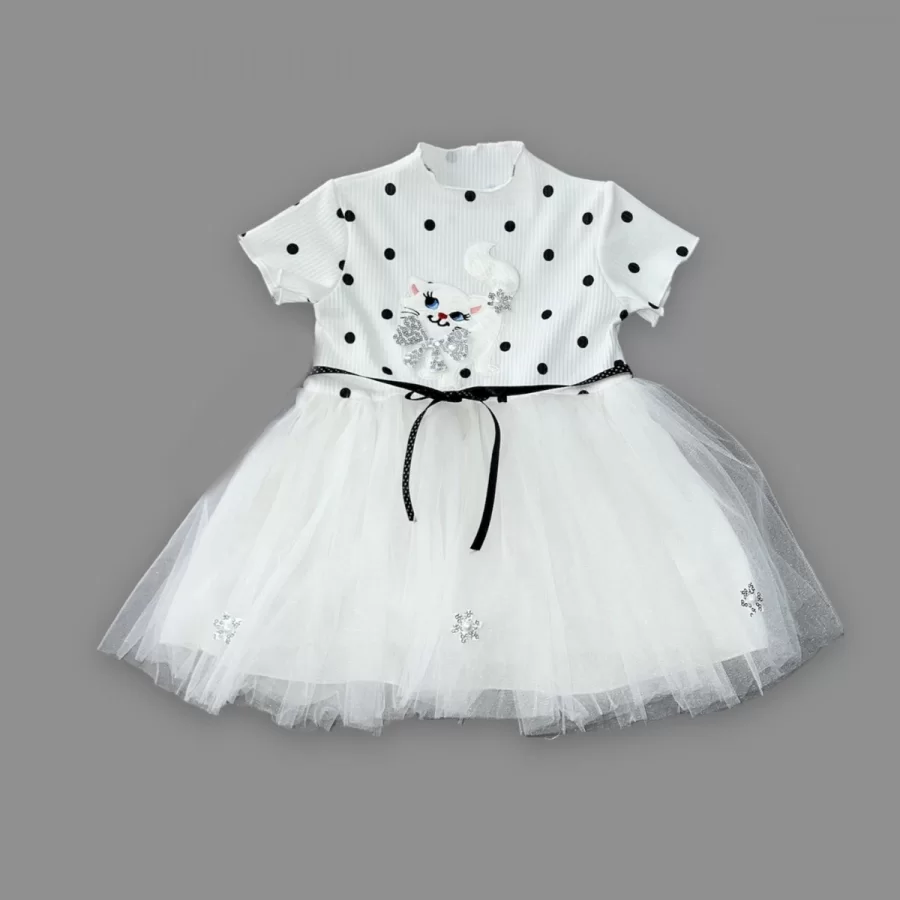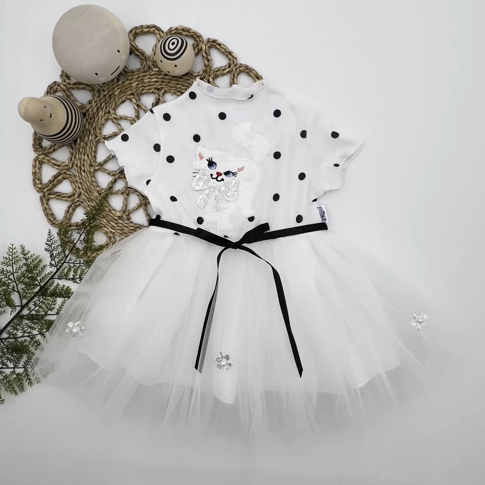 1-2-3 Yaş Payetli Kedicik Baskılı Puantiyeli Kız Bebek Elbisesi Beyaz adet