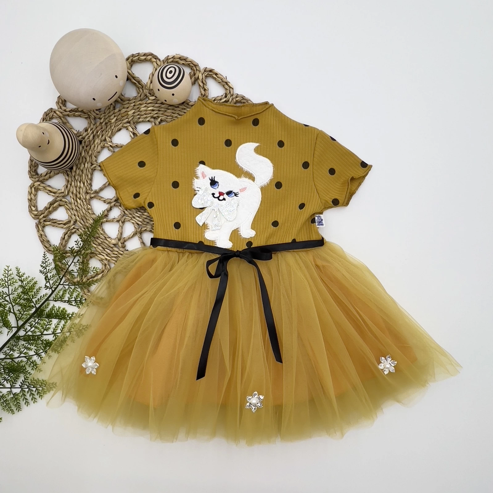 1-2-3 Yaş Payetli Kedicik Baskılı Puantiyeli Kız Bebek Elbisesi Hardal