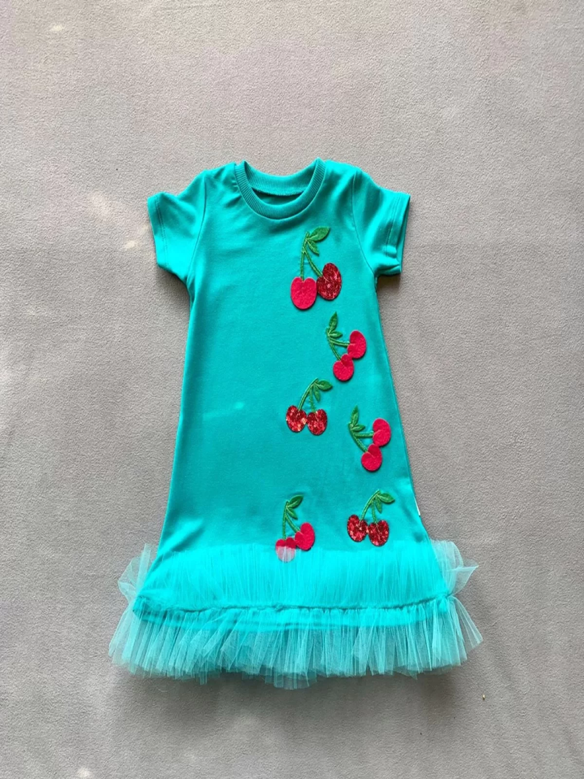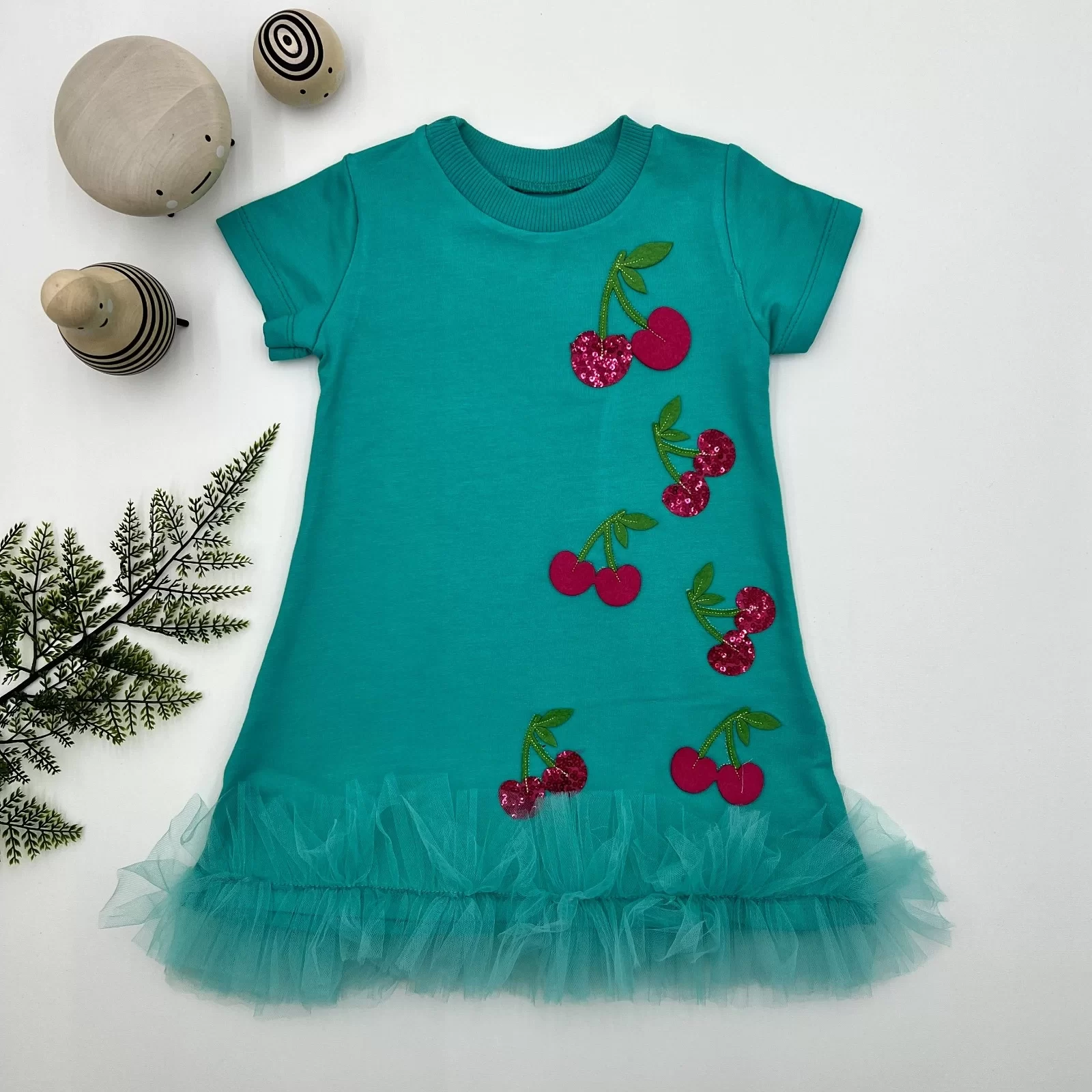 1-2-3 Yaş Payetli Kiraz Nakışlı Eteği Fırfırlı Jile Kız Çocuk Elbisesi