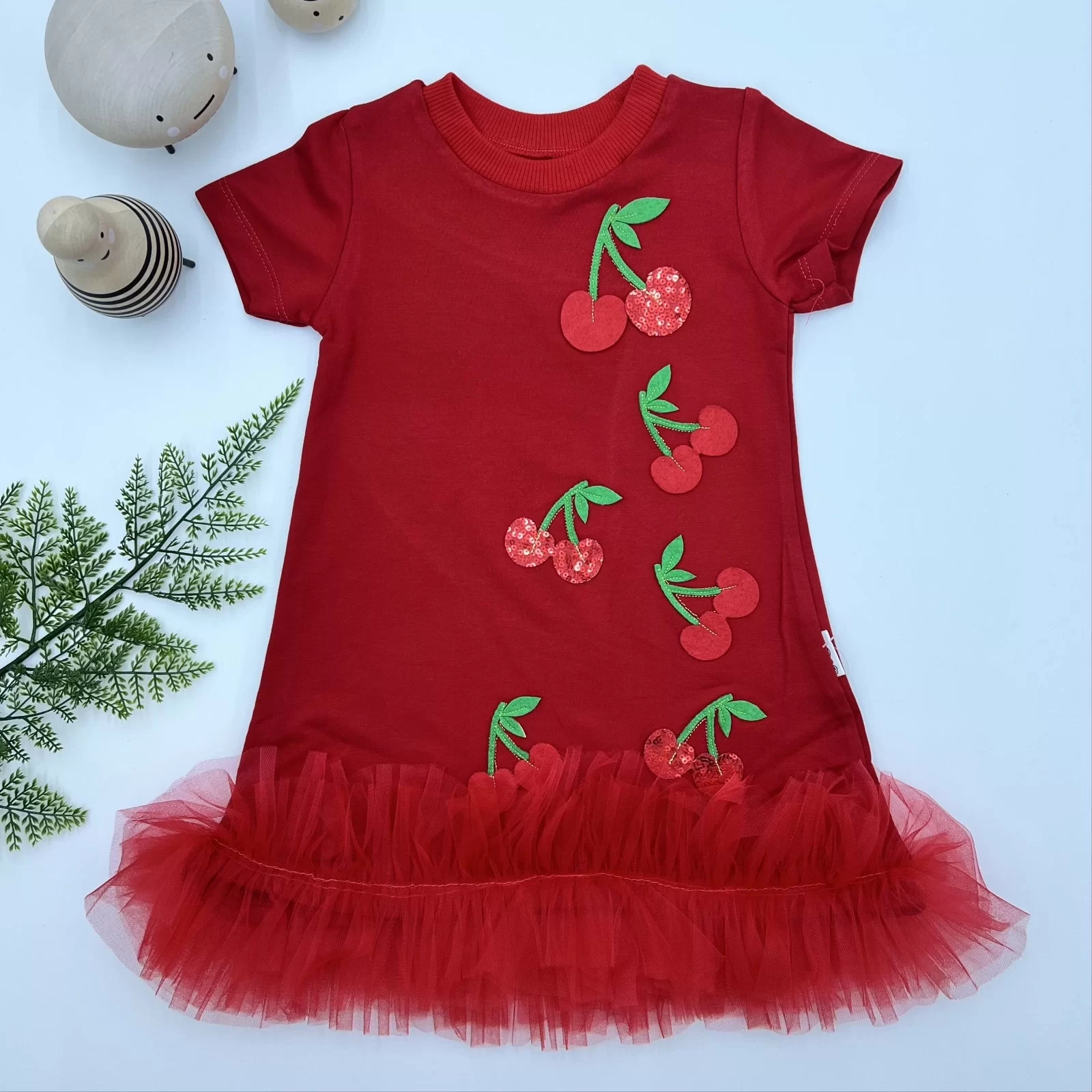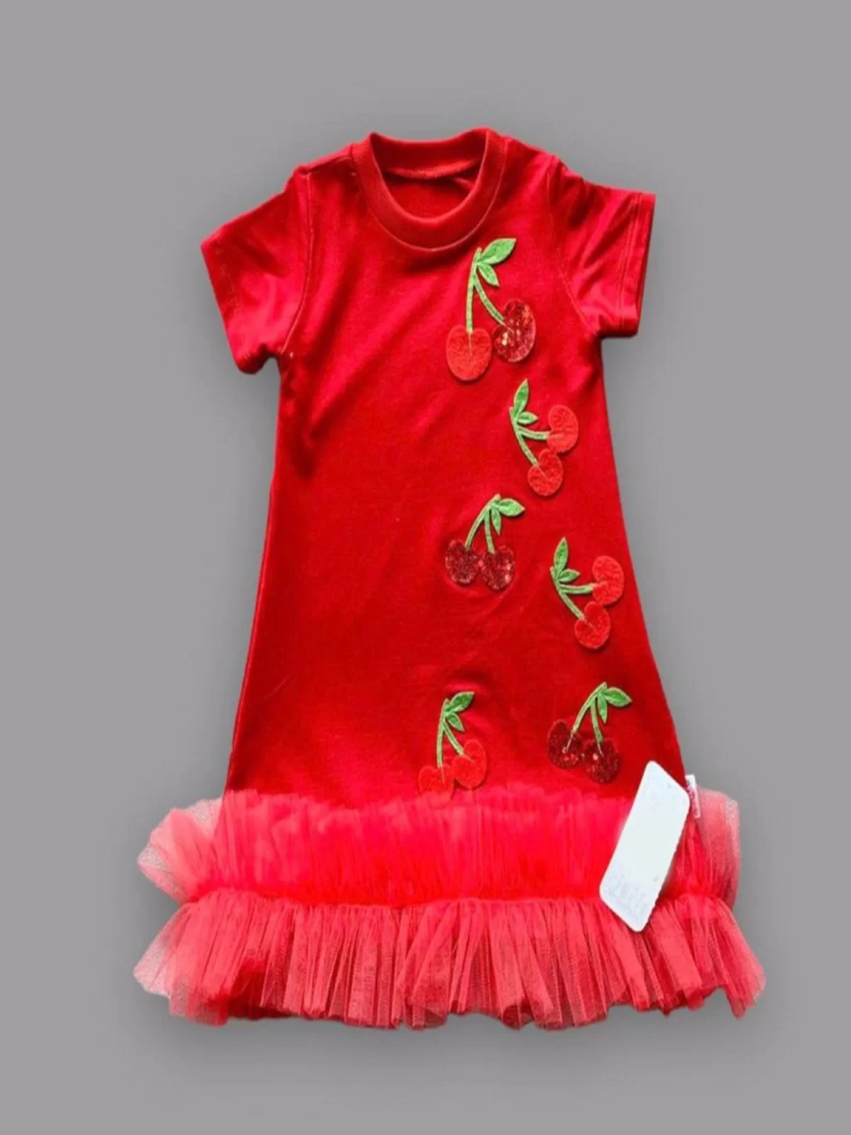 1-2-3 Yaş Payetli Kiraz Nakışlı Eteği Fırfırlı Jile Kız Çocuk Elbisesi