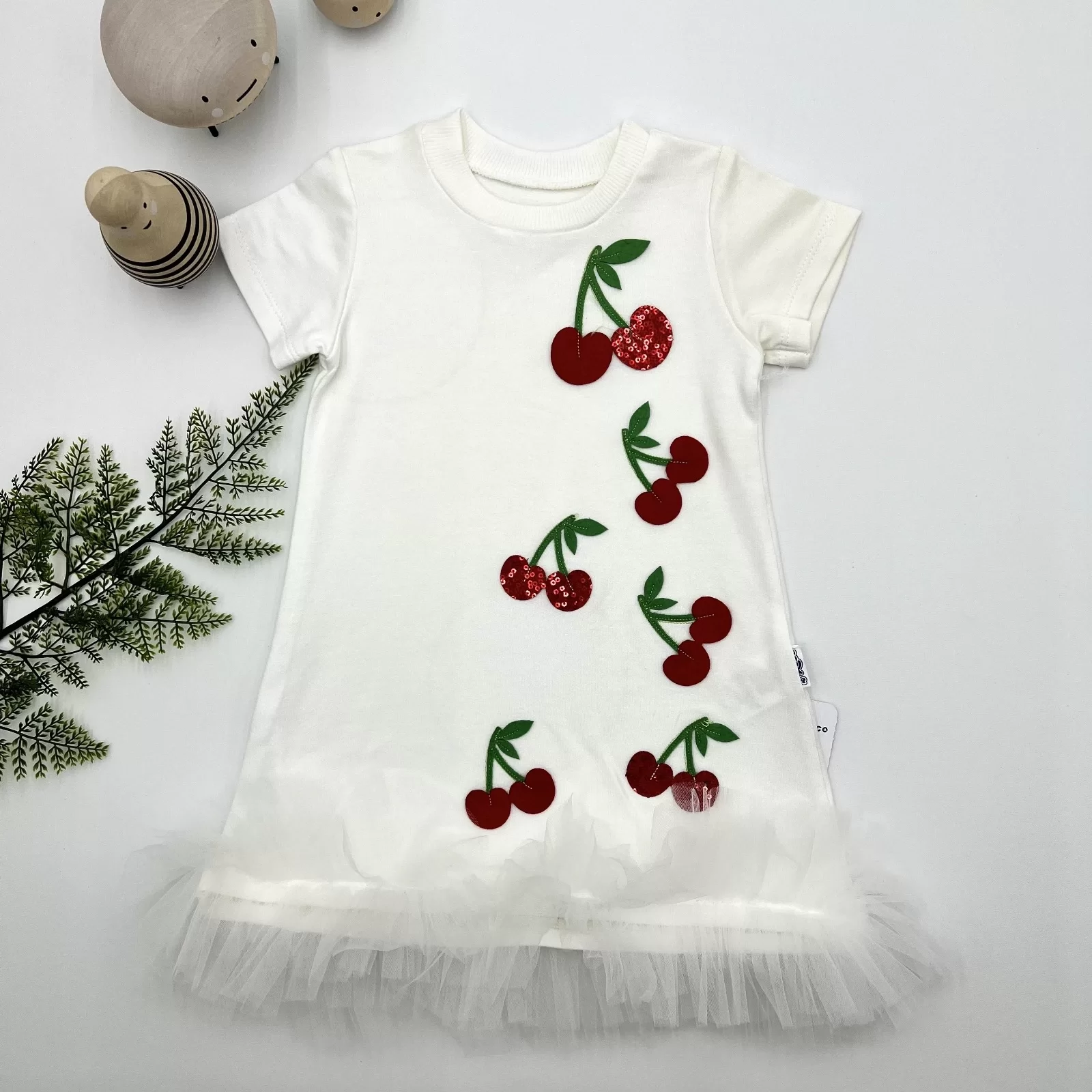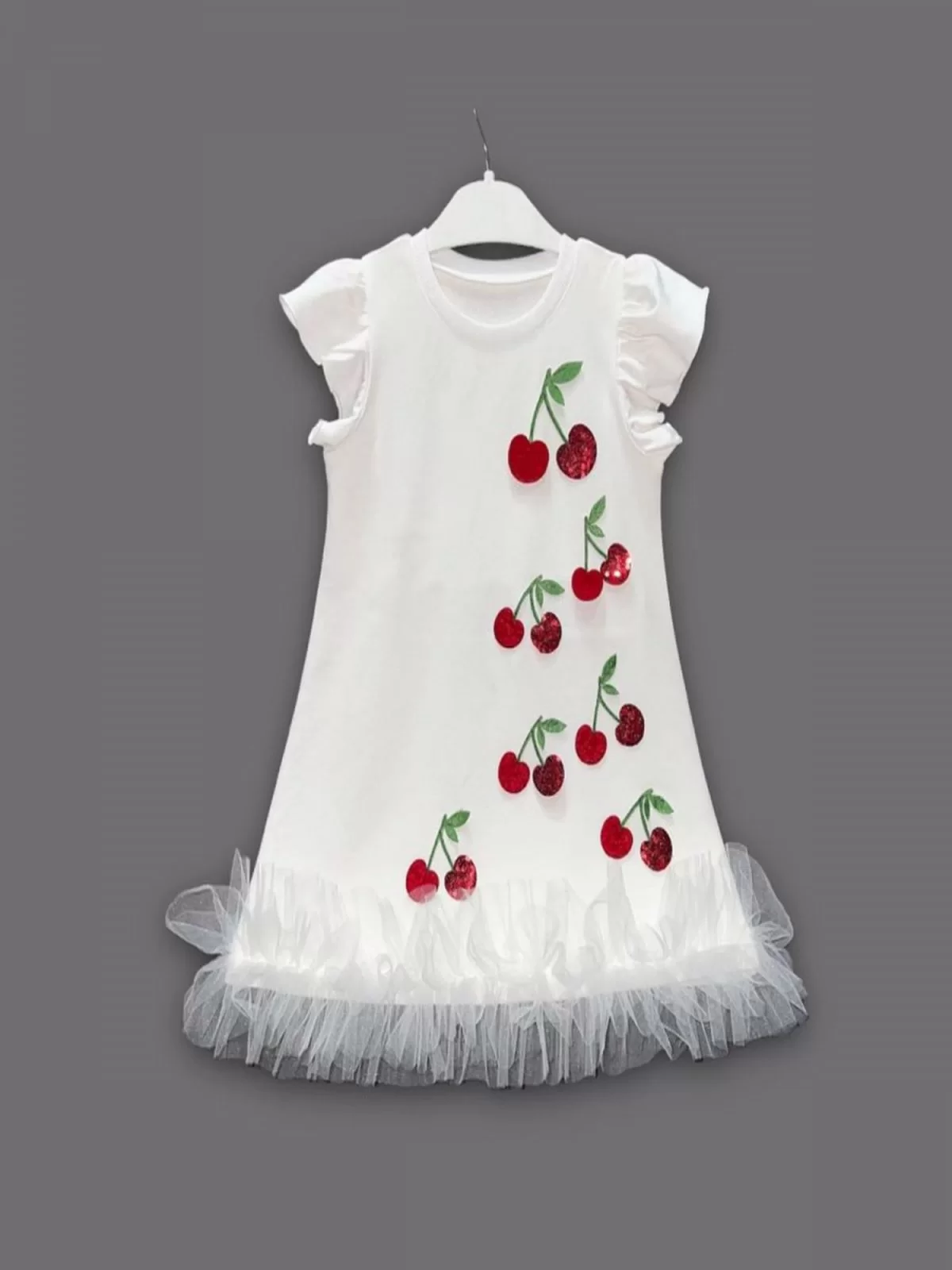 1-2-3 Yaş Payetli Kiraz Nakışlı Eteği Fırfırlı Jile Kız Çocuk Elbisesi Beyaz