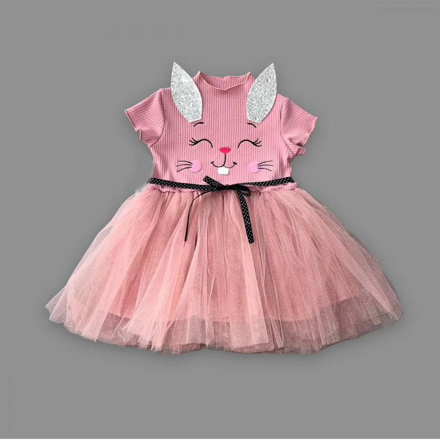 1-2-3 Yaş Payetli Kulak Tavşan Baskılı Kız Bebek Elbisesi Gül Kurusu